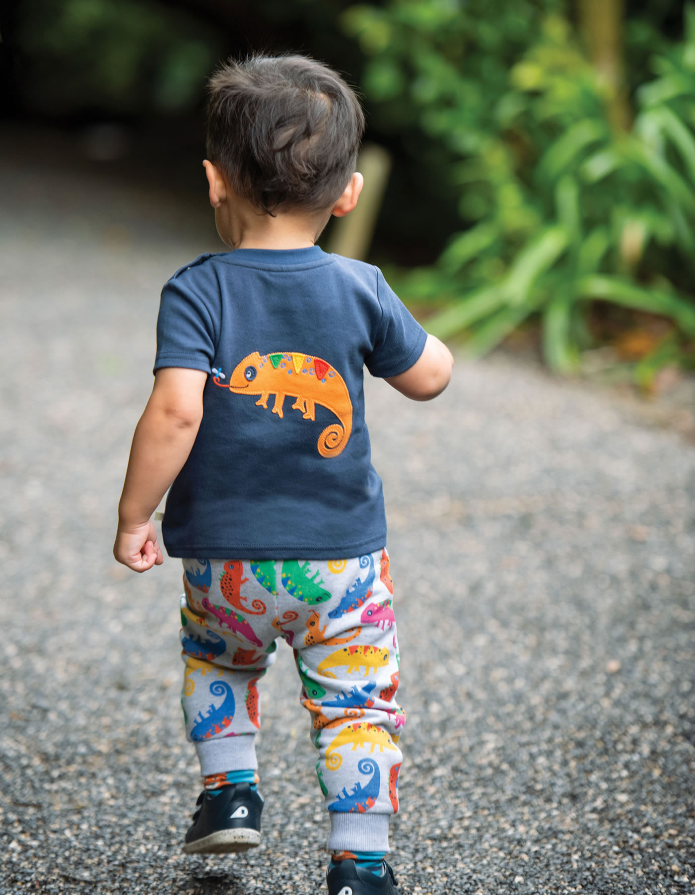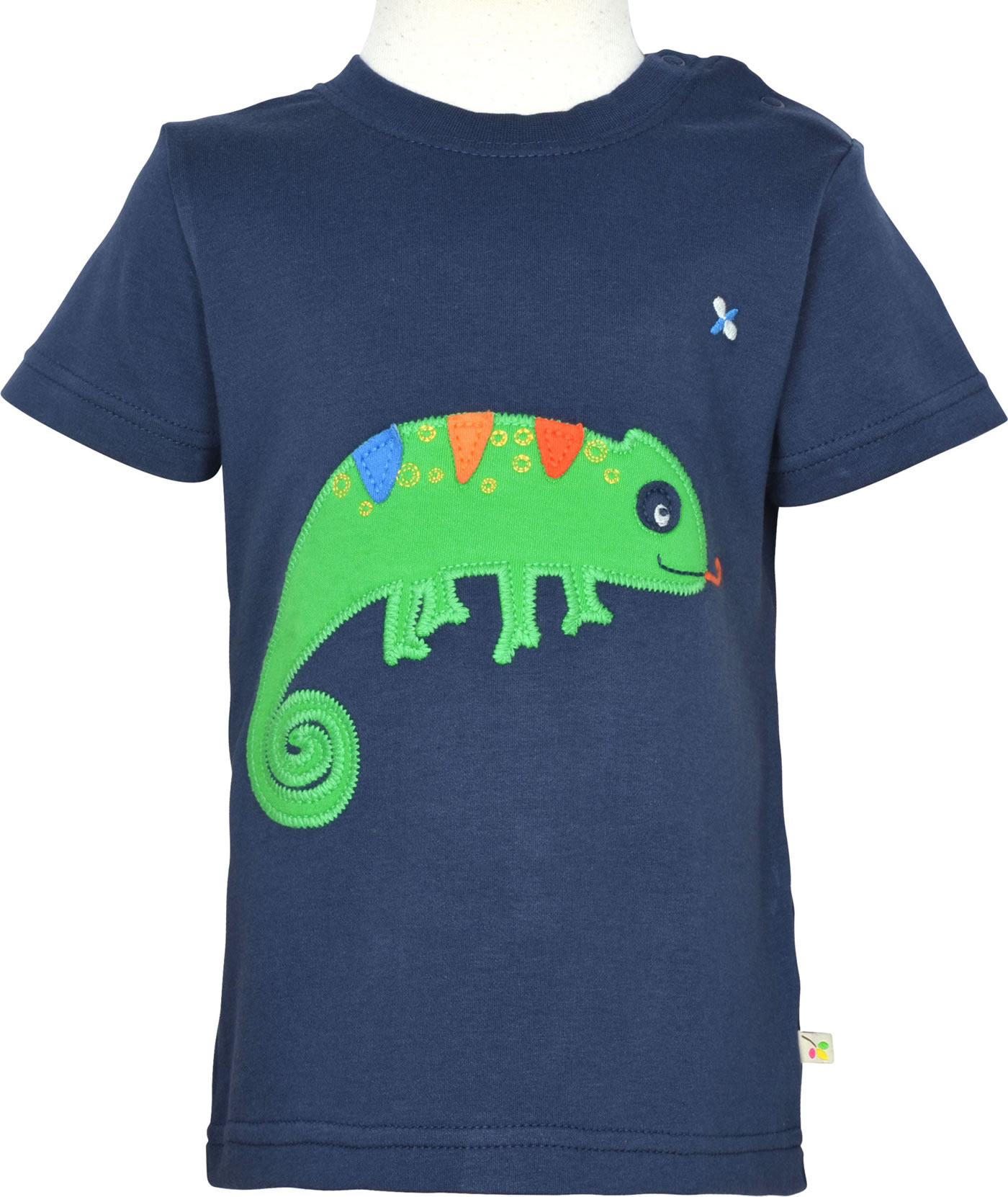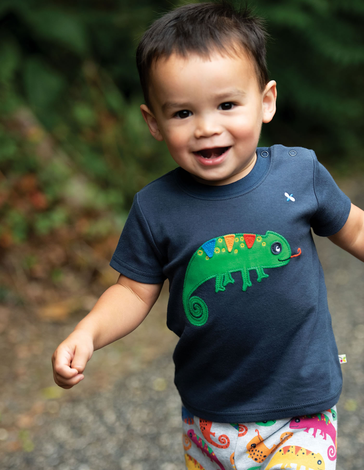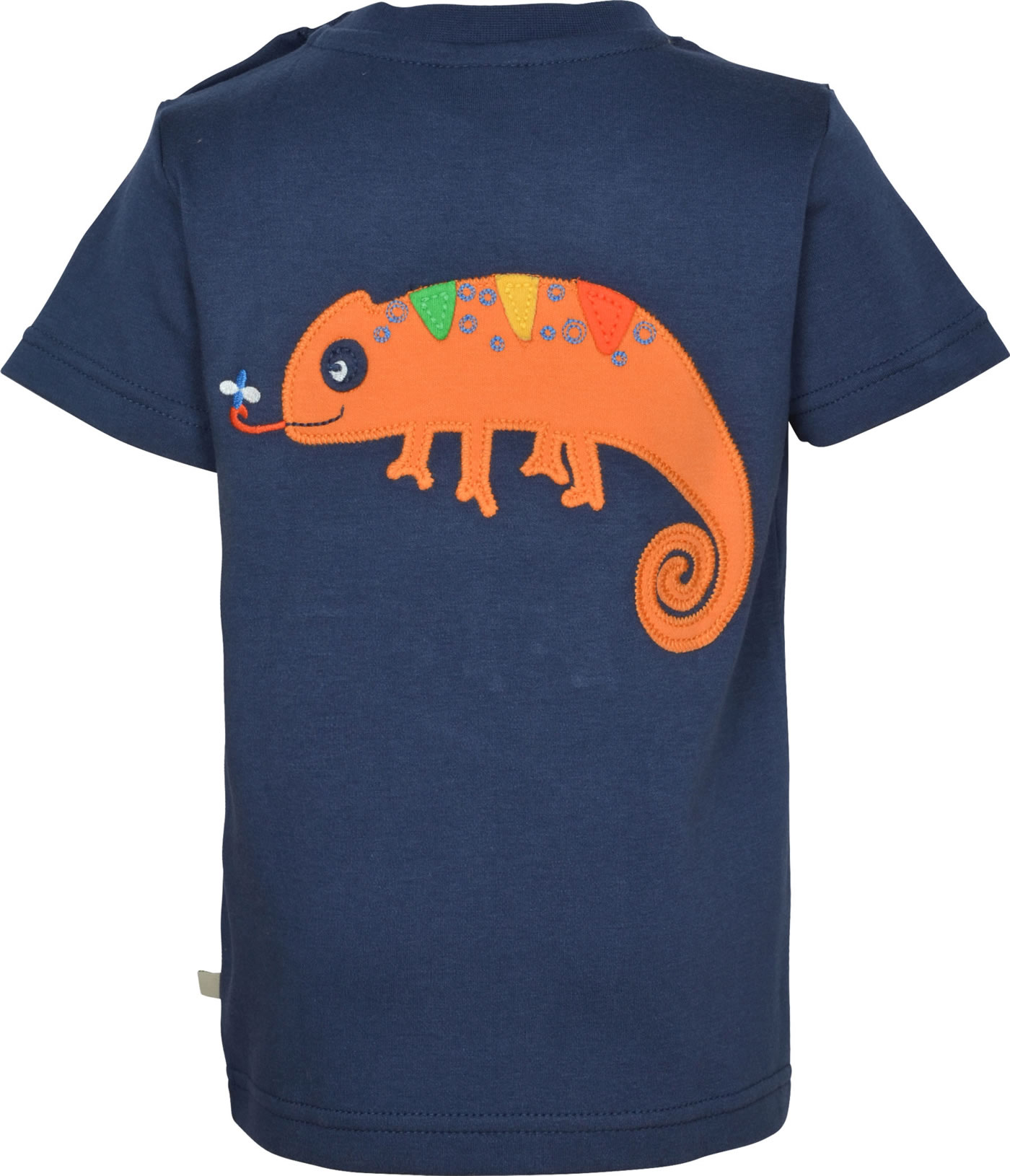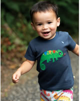 Kurzarm-Shirt von FRUGI für Jungen. Das T-Shirt hat eine Applikation mit einem grünen Chamäleon auf der Vorderseite und einem orangenen Chamäleon auf der Rückseite. Das weiche Material aus organischer Baumwolle fühlt sich angenehm auf der Haut an. Druckknöpfe auf der Schulter erleichtern das An- und Ausziehen.