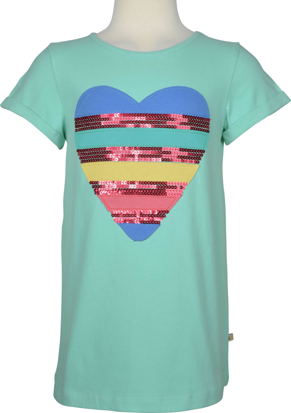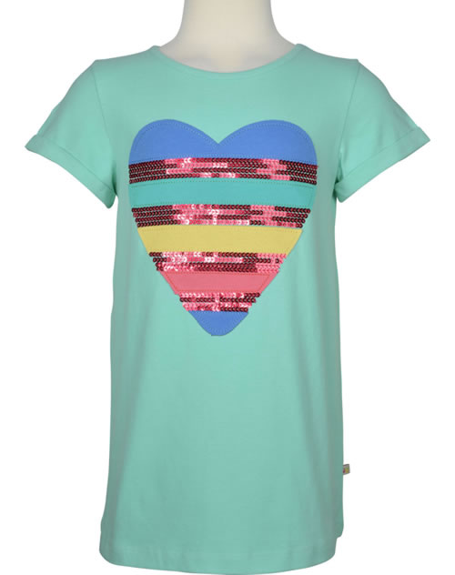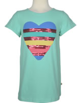 Hübsches Kurzarm Shirt für Mädchen in mintgrün von FRUGI. Ein bezauberndes Detail ist die farbenfrohe Herz-Applikation mit Pailetten auf der Vorderseite. Das Shirt ist ideal für warme Sommertage und lässt sich gut kombinieren.