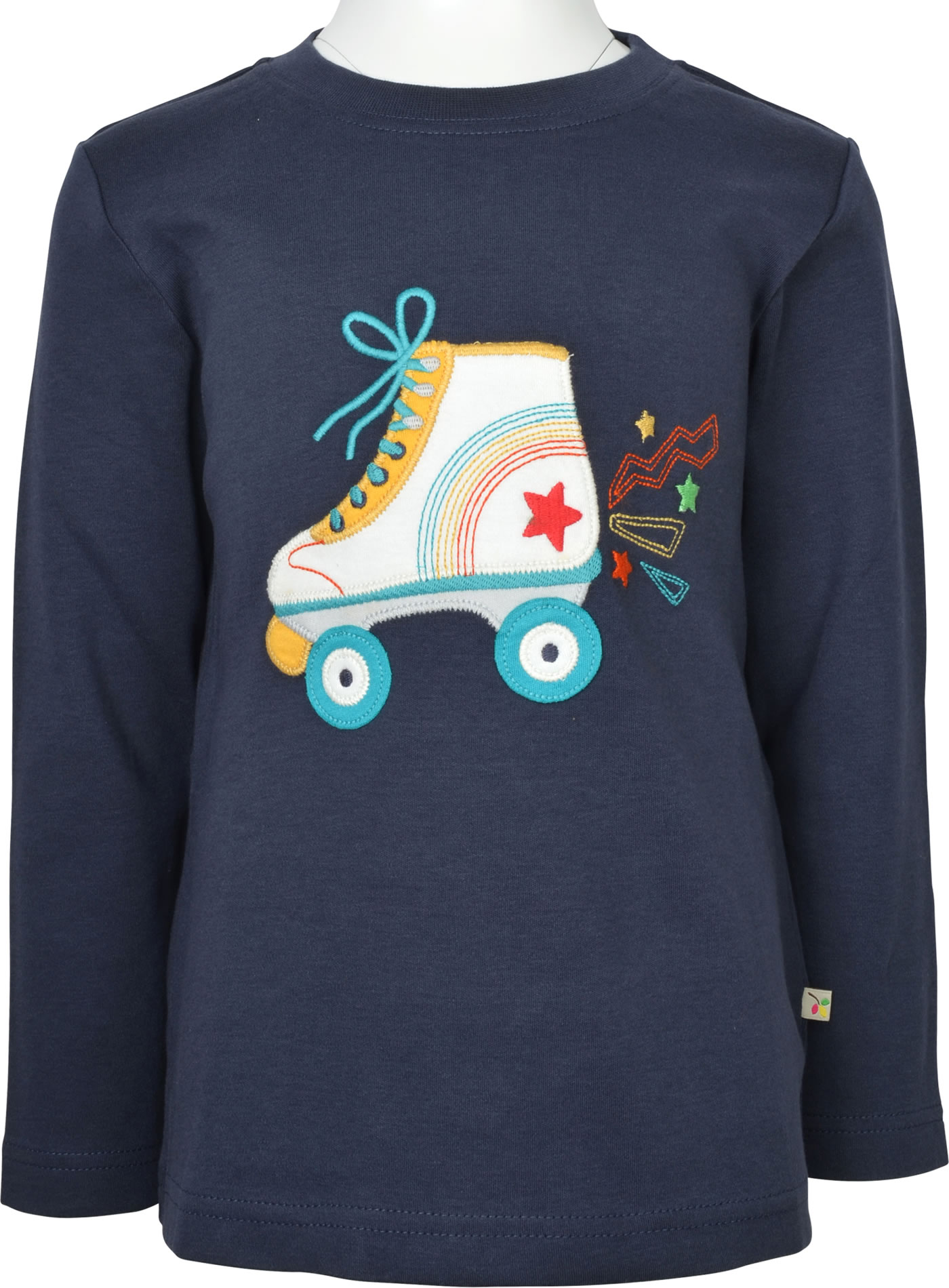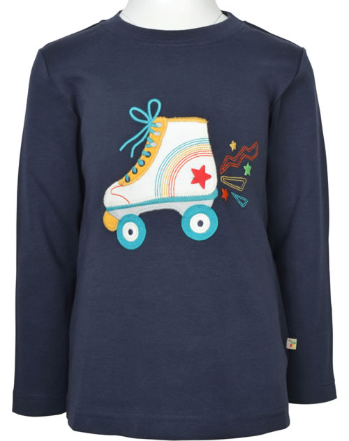 Langarm-Shirt aus organischer Baumwolle von FRUGI. Das Lieblings-Shirt lässt sich prima kombinieren. Tolle Hingucker sind die Applikation mit dem bunten Rollschuh auf der Vorderseite.