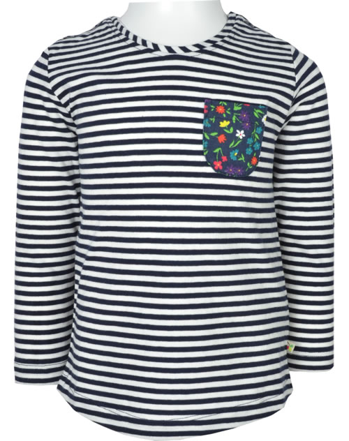 Langarm-Shirt aus weicher organischer Baumwolle von FRUGI. Das gestreifte Lieblings-Shirt lässt sich prima kombinieren. Ein schönes Detail ist die kleine Tasche mit Blumen-Motiven auf der Vorderseite.