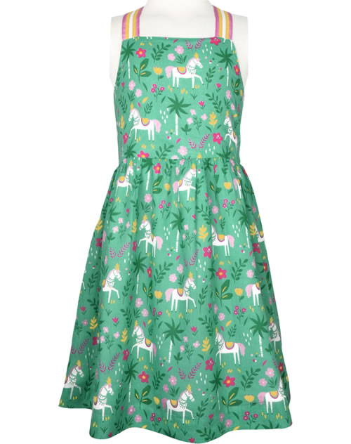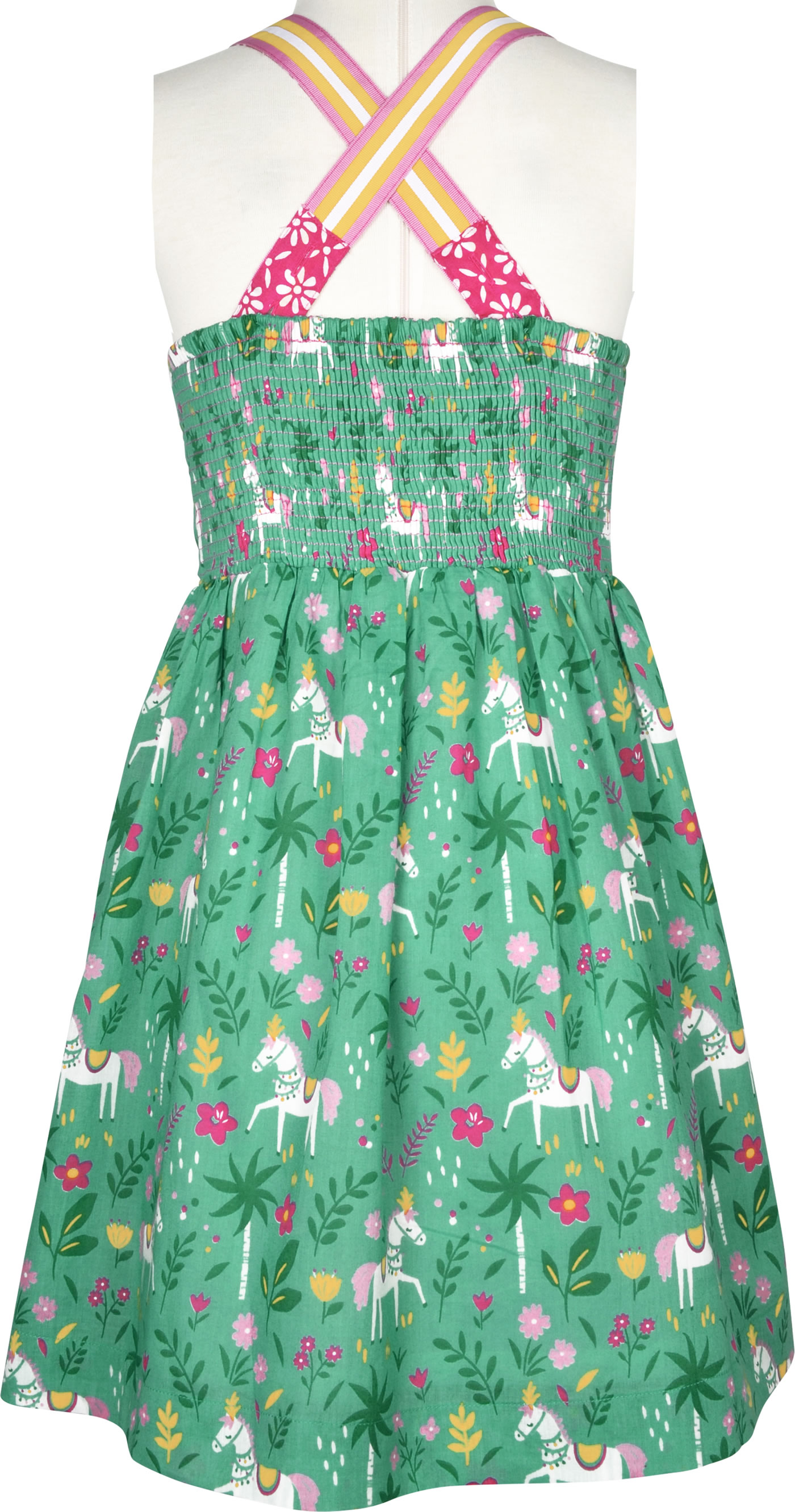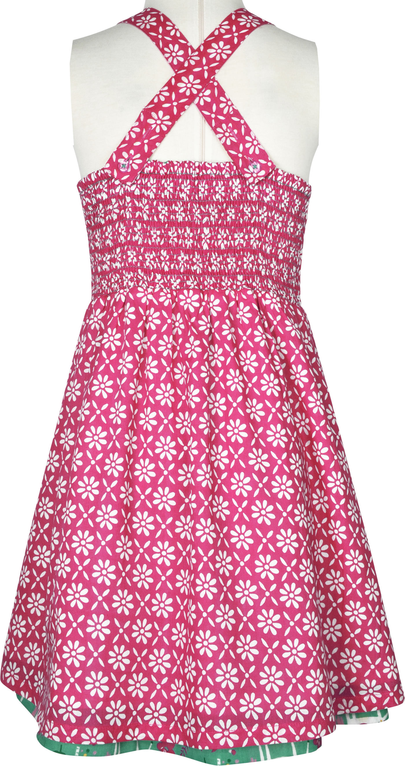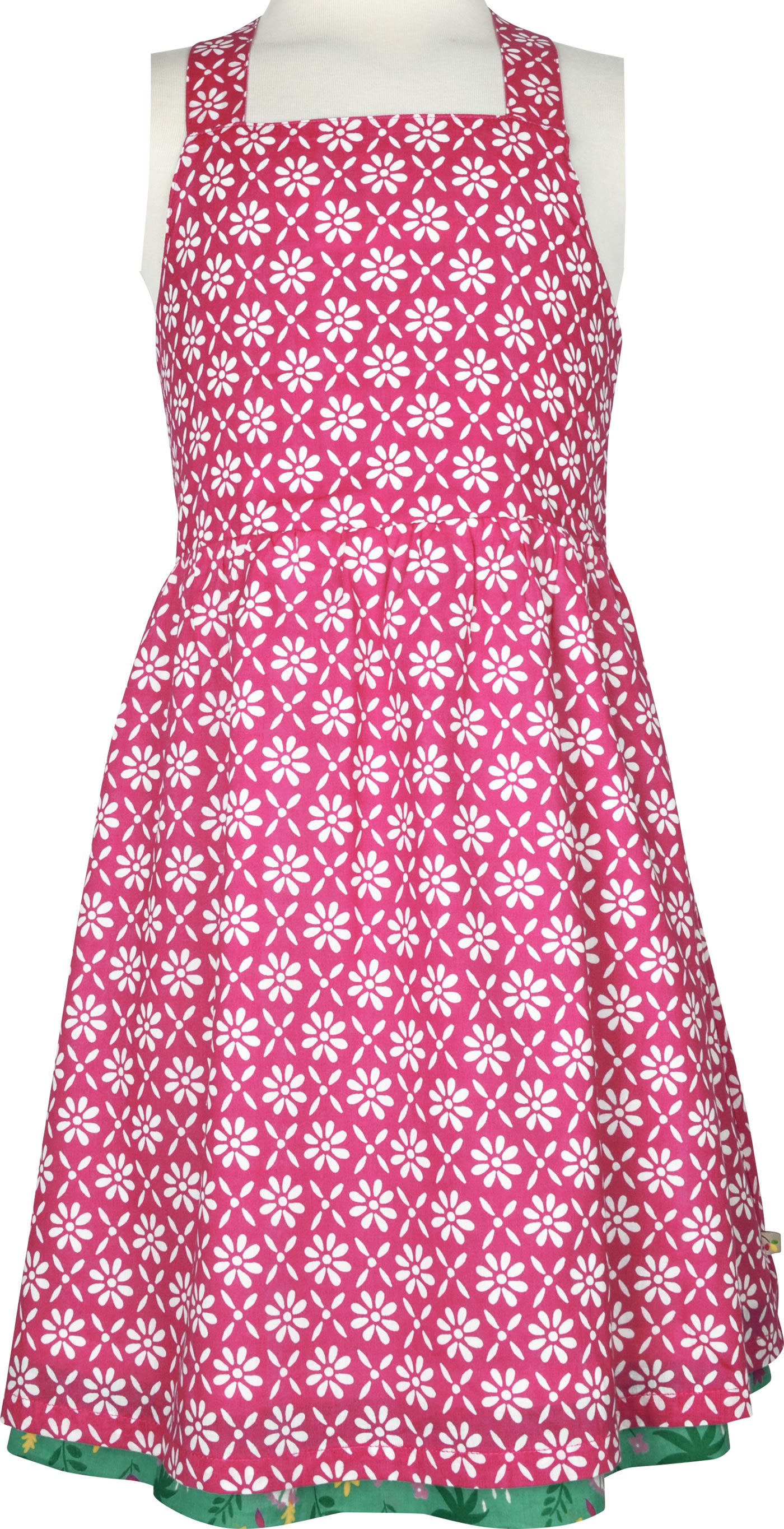 Ärmelloses Kleid von FRUGI. Das Kleid aus festem Baumwoll-Stoff ist weit geschnitten und bietet viel Bewegungsfreiheit. Für einen guten Sitz sorgt die Raffung auf dem Rücken. Die gekreuzten Träger sind mit Hilfe von Knöpfen in der Länge verstellbar. Das Kleid hat auf der einen Seite ein tolles Muster mit Pferden und Blumen. Und wird das Kleid umgedreht, kommt ein pink-weißes Blumenmuster zum Vorschein. Weißes Futter im Rock sorgt für Blickdichte.