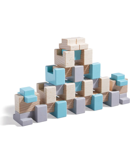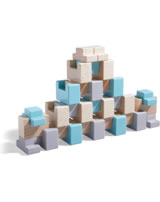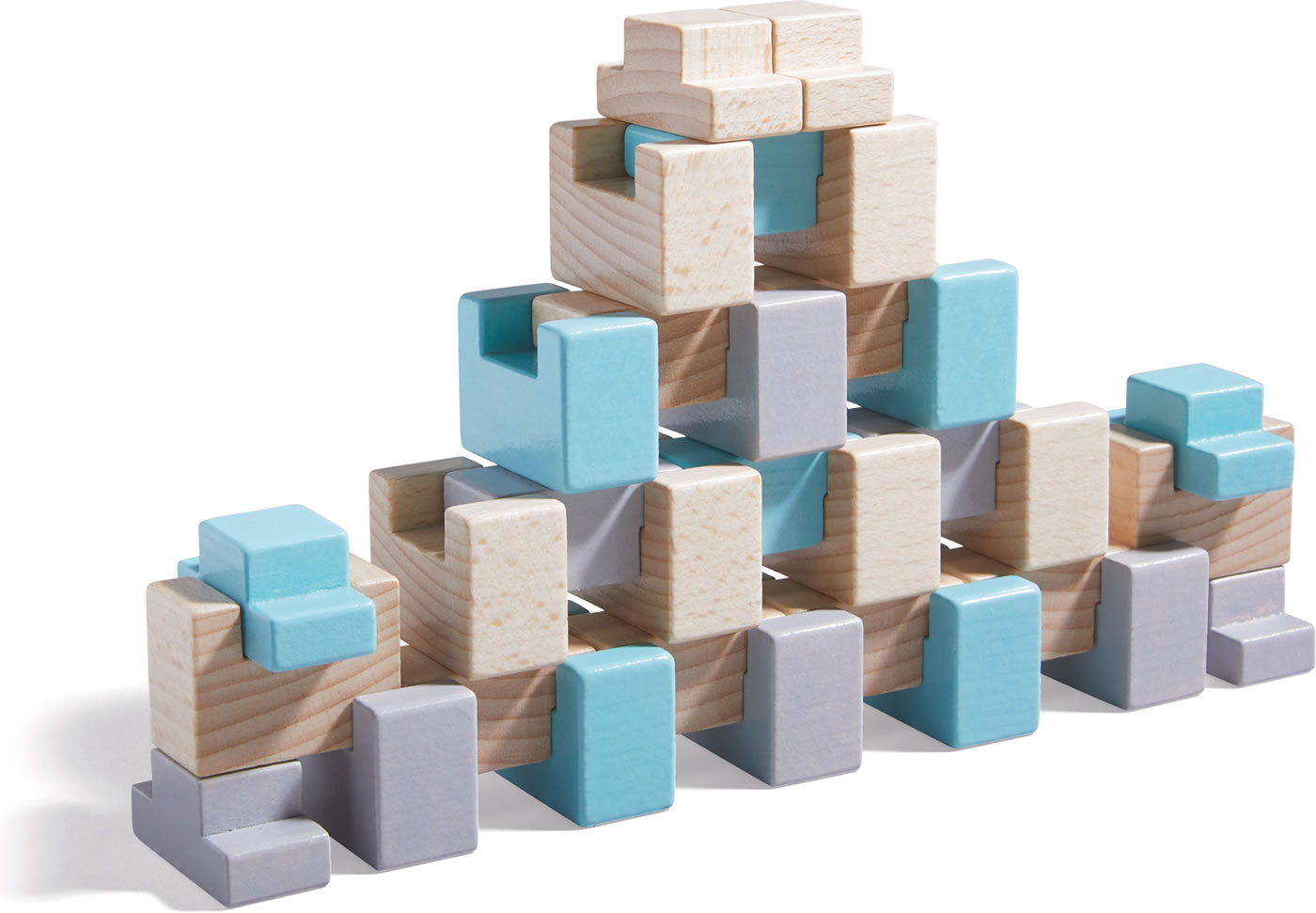Beim 3D-Legespiel Formenmix von HABA sorgen die U- und T-Form der Steine für raffinierte Muster und extra Stabilität. Die ineinandergreifenden Formen fordern zu waghalsigen Bauwerken heraus. Wem gelingt es, der Schwerkraft ein Schnippchen zu schlagen und so zu bauen, dass die Steine nicht zusammenfallen? Das spannende Legespiel bietet jungen Tüftlern eine Menge Nervenkitzel. Ganz nebenbei trainieren die Kleinen ihre Feinmotorik und räumliches Vorstellungsvermögen. Wer sich inspirieren lassen möchte, findet im Vorlagenleporello Anregungen zum Nachbauen. Ob freies Spiel oder Bauen nach Anleitung: Das 3D-Legespiel Formenmix von HABA verspricht in jedem Fall eine Menge Stapelspaß in unzähligen Varianten!