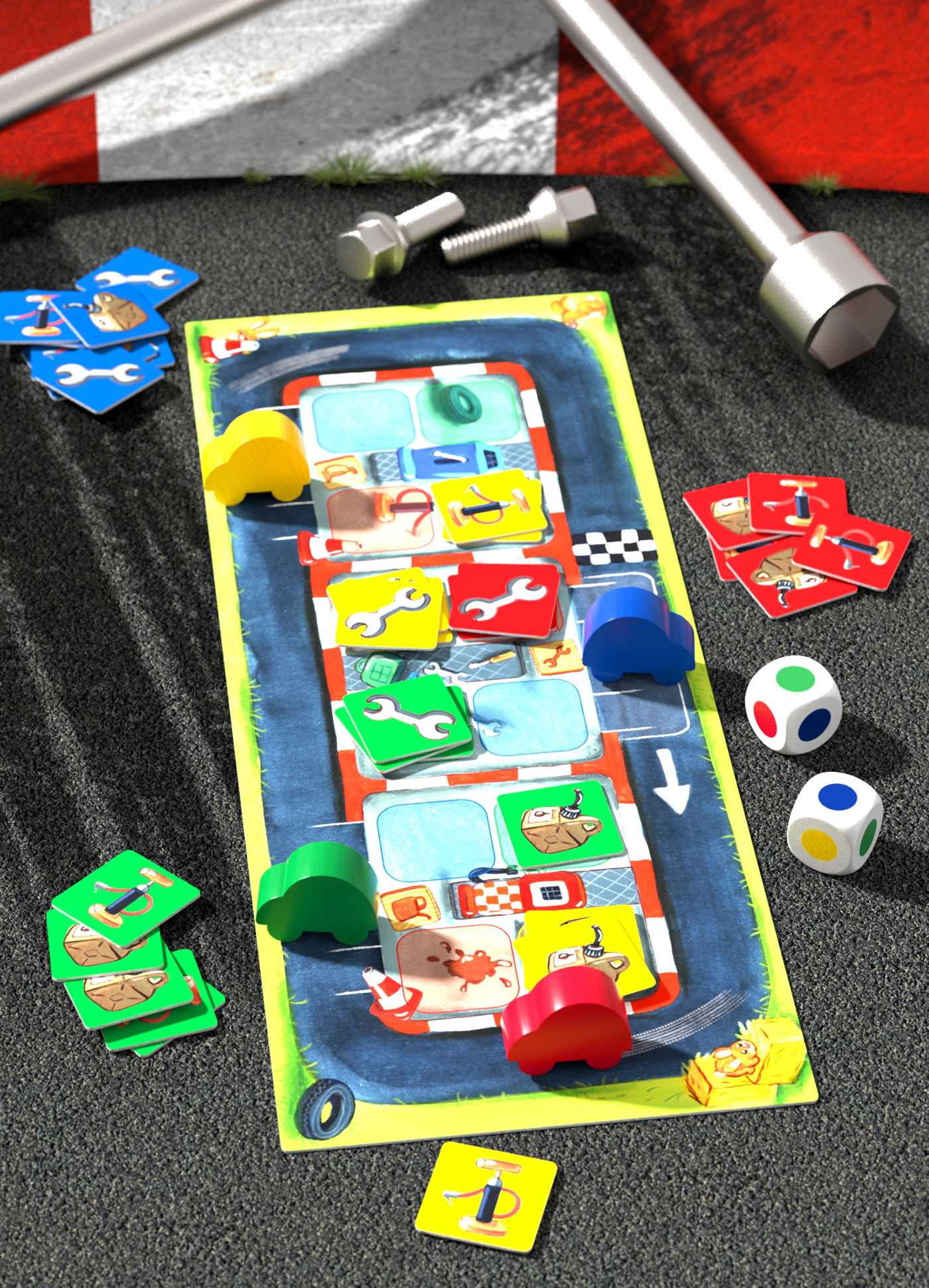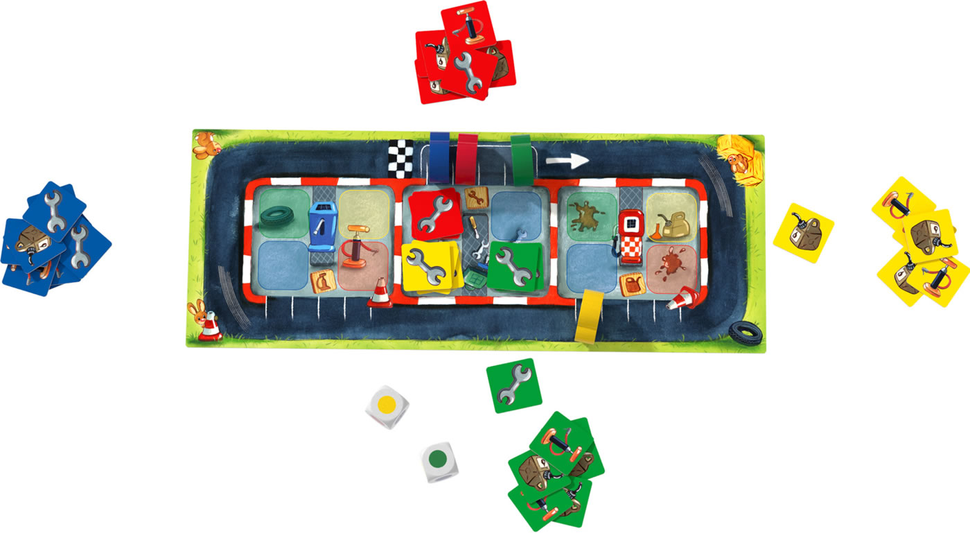 Rennstart! Aber Vorsicht: Nur wer beim Boxenstopp genauso schnell ist wie auf der Piste, hat das Zeug zum echten Champion! Während des Rennens müssen die Spieler regelmäßig in die Box und dort ihre Boxenstopp-Plättchen ablegen. Die Würfel entscheiden, wie lange jeweils in der Box verweilt werden muss. Wer zuerst eine Runde mit allen Boxenstopps absolviert hat, gewinnt.