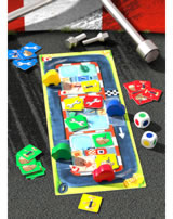 4 Autos, 36 Boxenstopp-Plättchen (je 9 in den Farben Blau, Rot, Grün und Gelb), 1 Spielplan, 2 Farbwürfel, 1 Spielanleitung