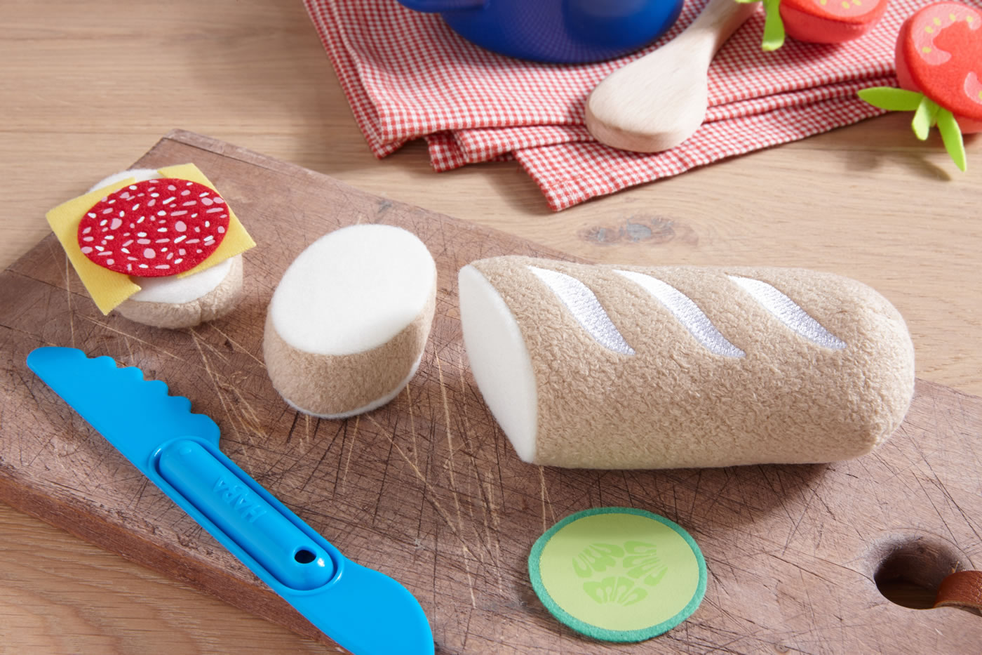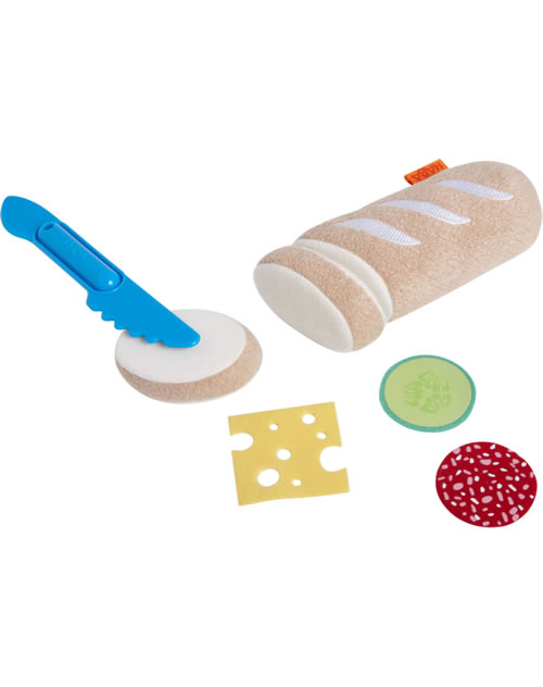 Mit etwas Geschick lassen sich aus dem Baguette kinderleicht zwei Scheiben abschneiden. Ob Käse, Salami oder beides zusammen – mit einer Scheibe Gurke schmecken diese leckeren Sandwiches allen Puppenkindern.