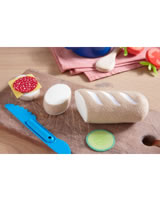 1 Baguette mit 2 Scheiben zum Abschneiden, 1 Gurkenscheibe, 1 Salamischeibe, 1 Käsescheibe, 1 Messer