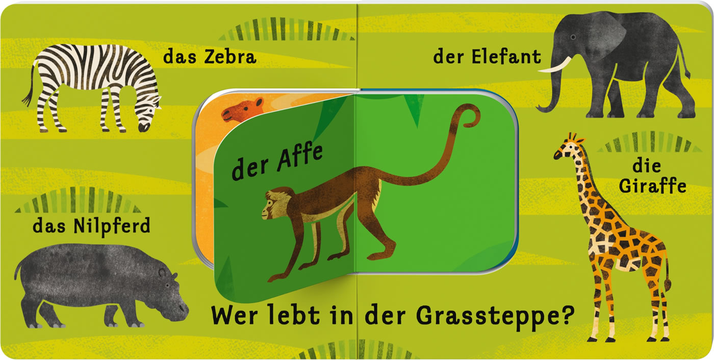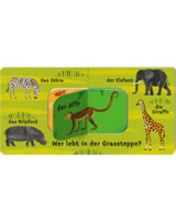 Der Elefant lebt in der Grassteppe, der Affe bewohnt den Regenwald. Aber wo ist die Schildkröte zu Hause? In diesem Buch können Kinder viele verschiedene Tiere benennen und sie ihren verschiedenen Lebensräumen zuordnen. Besonderes Highlight ist das kleine Buch im Buch! Also immer so lange blättern, bis das jeweilige Tier in seiner richtigen Umgebung steht.