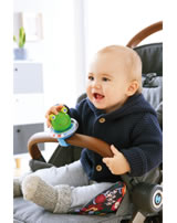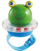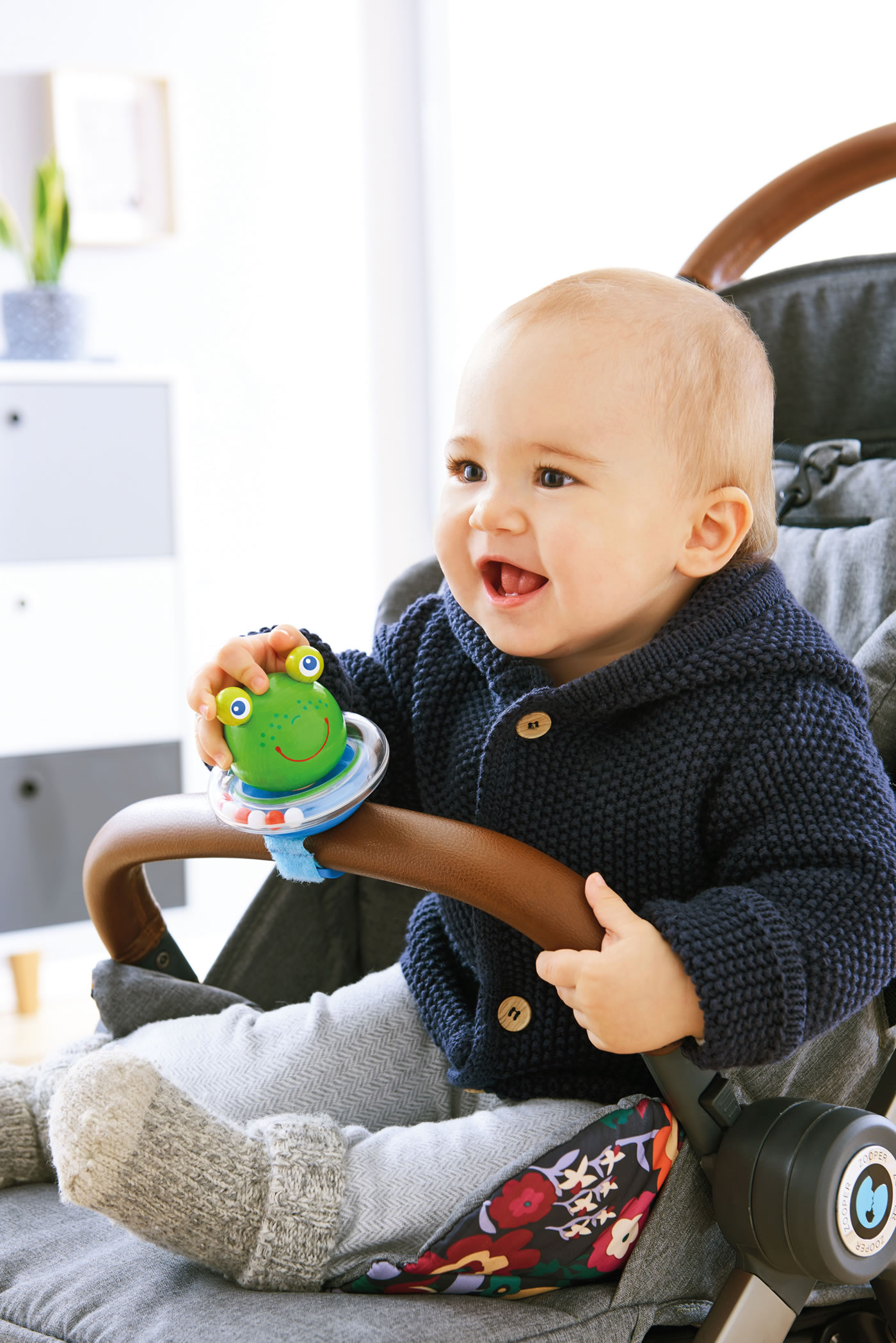 Die Buggy-Spielfigur Frosch von HABA macht jeden Buggy-Ausflug zum Erlebnis! Dank der großen Schlaufe mit Klettverschluss lässt sich die Spielfigur ruck, zuck vorne an den Buggy befestigen. Dort zieht der lustige Frosch mit seinem fröhlichen Gesicht die Aufmerksamkeit der kleinen Spazierfahrer auf sich und sorgt unterwegs für gute Laune. Babys greifen gerne nach dem Frosch und beobachten, wie die Kügelchen im transparenten Kunststoffring munter hin und her rollen. Mit der Quietsche im Frosch können sie sogar auf dem Gehsteig für Platz sorgen – auch das macht Riesenspaß!
