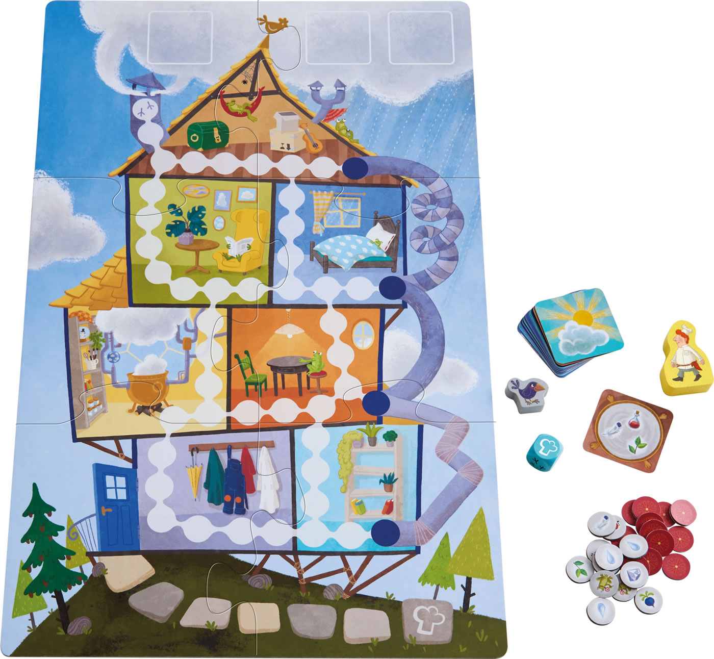 1 Spielplan (aus 6 Teilen), 1 Wolkenmacher, 1 Krähe, 1 Würfel, 21 Rezeptkarten, 24 Zutatenplättchen (davon 3 mit Wetterfrosch), 1 Spielanleitung
