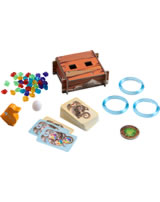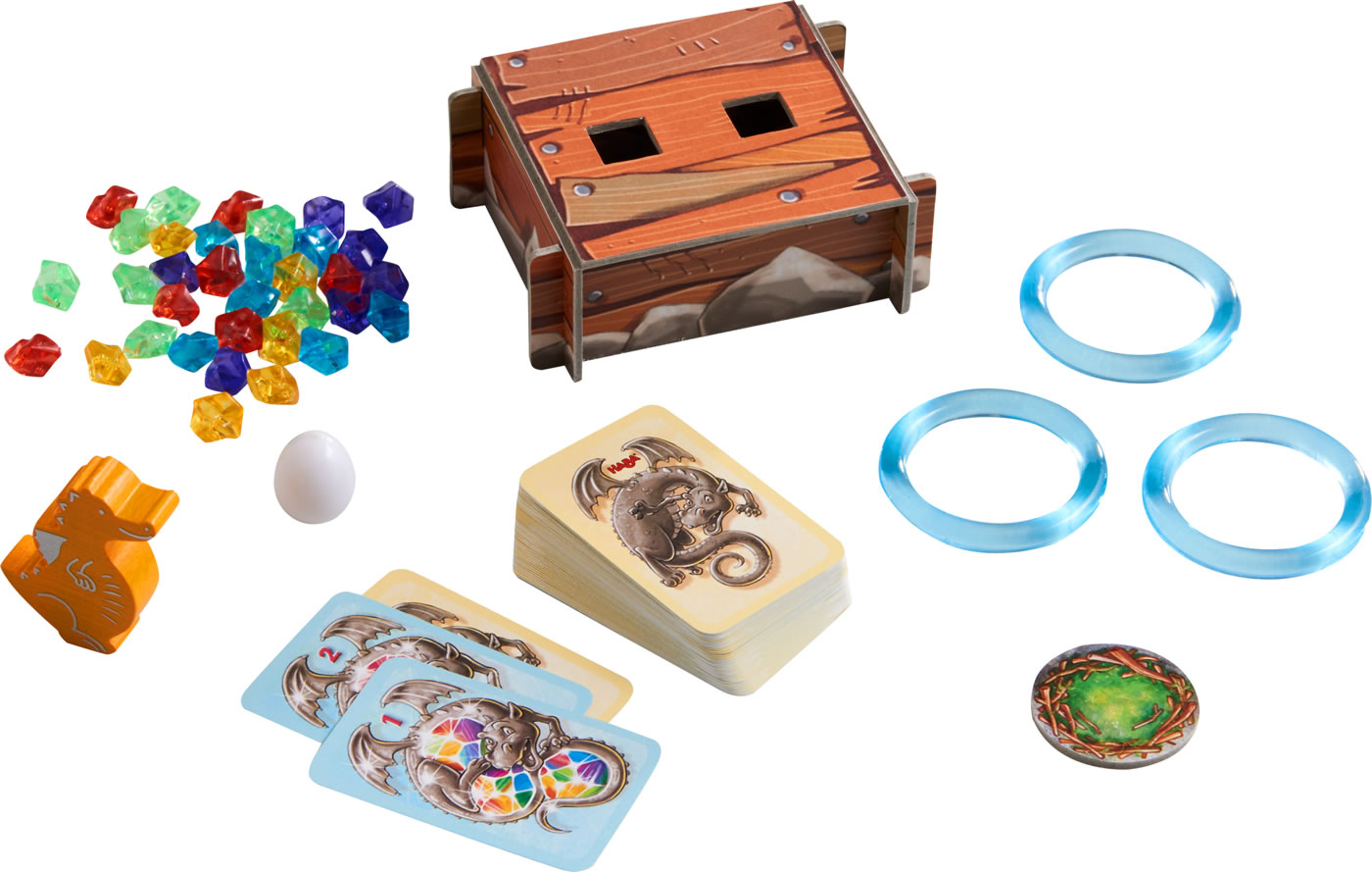 3 Eis-Ringe, 35 Funkelsteine (je 7 in 5 Farben), 1 Drachen-Ei, 1 Nest-Plättchen , 1 Drachenmama, 1 Schatzkiste, 48 Amulett-Karten, 1 Spielanleitung