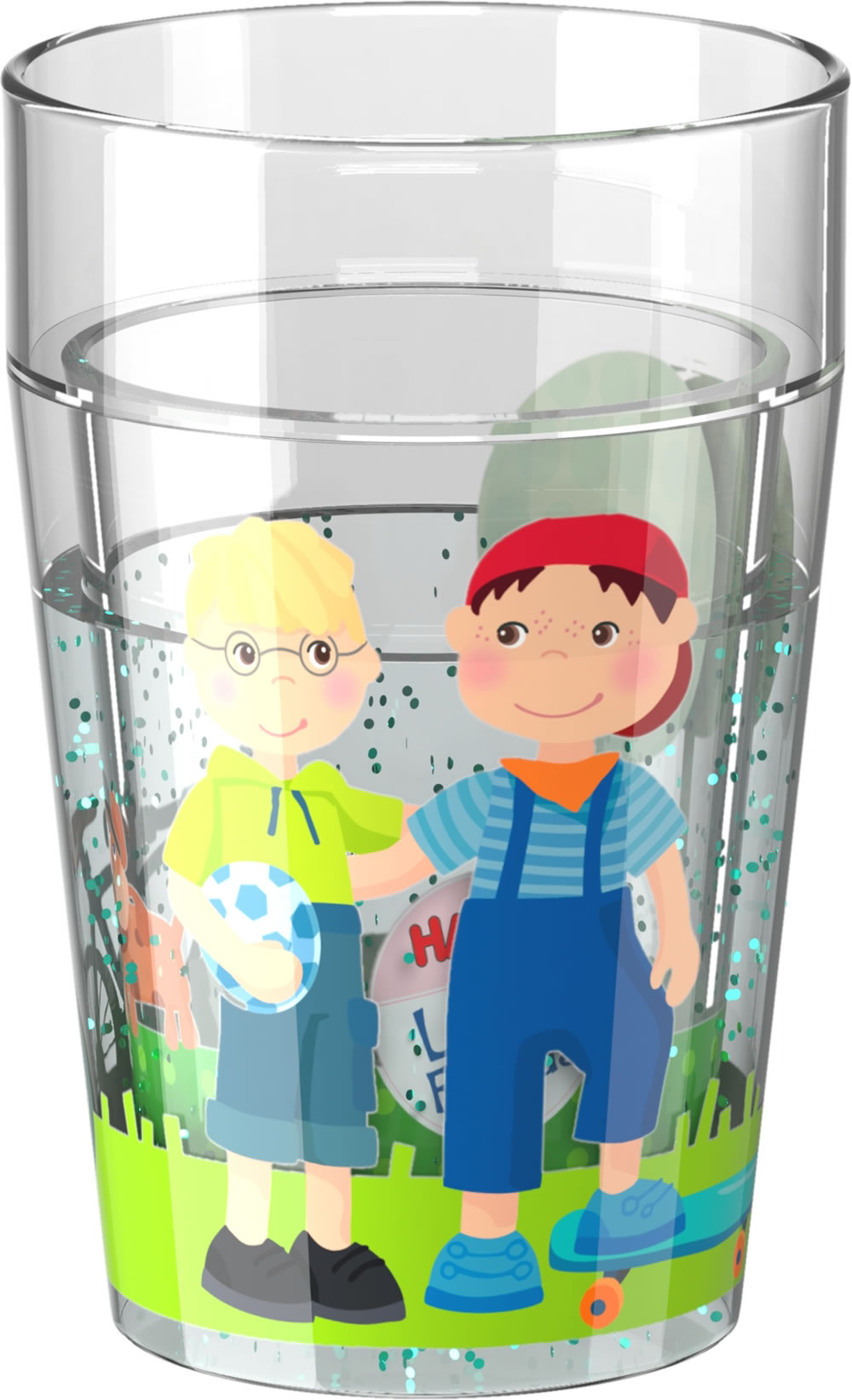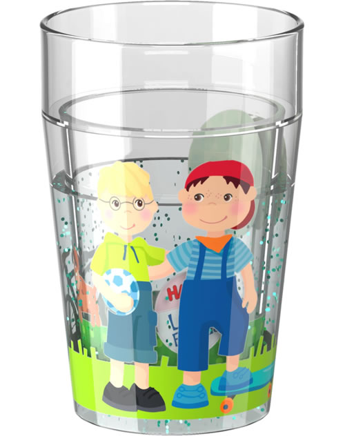 Der Becher ist doppelwandig, mit Flüssigkeit und Glitzer gefüllt.