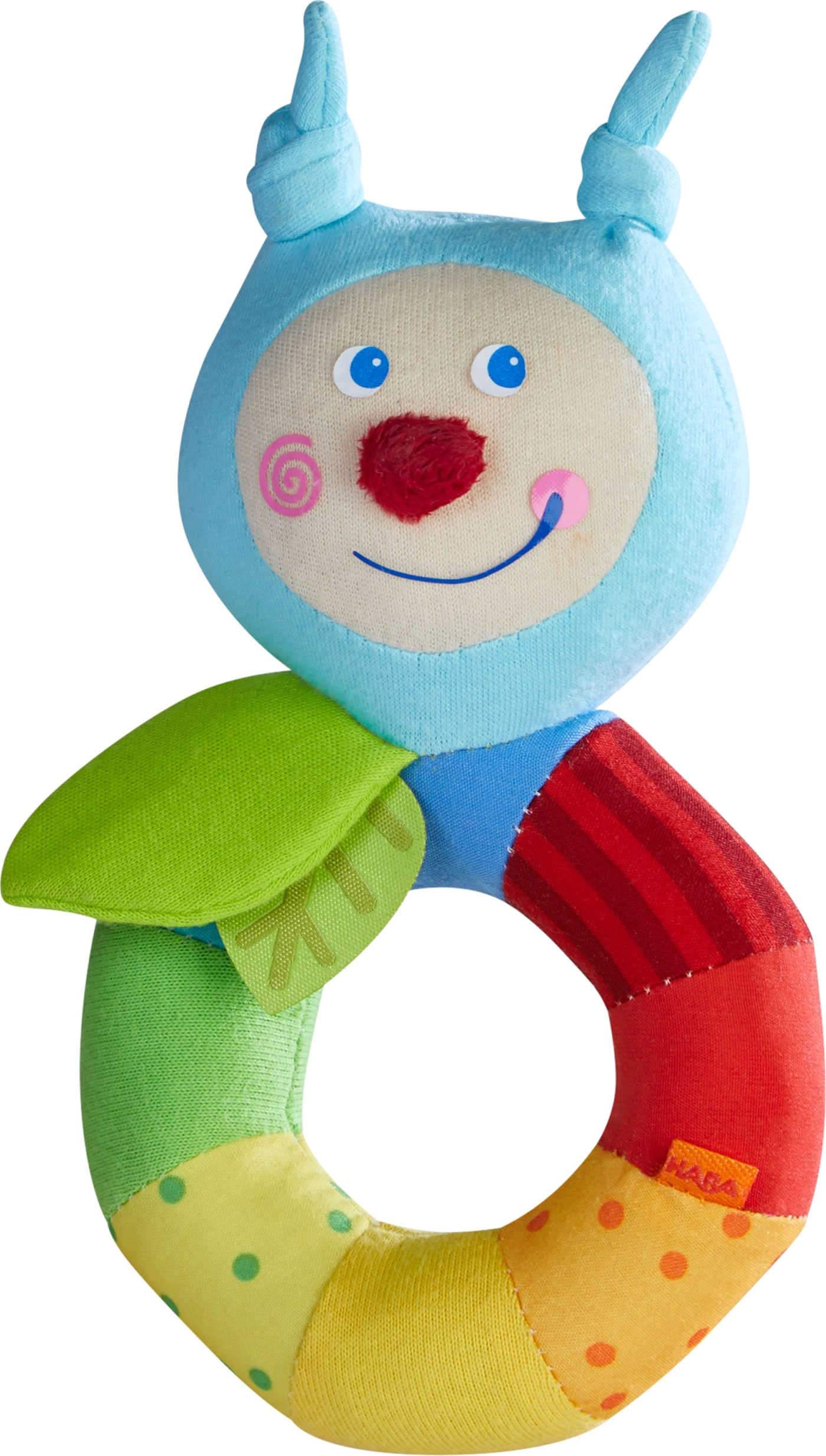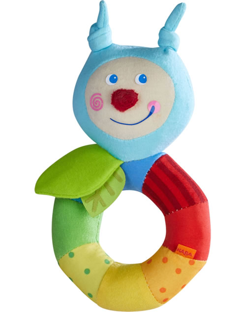 Die niedliche Raupe Mina lädt zum Spielen und Entdecken ein und der wunderbar weiche Greifring ist für kleine Kinderhände gut zu fassen.