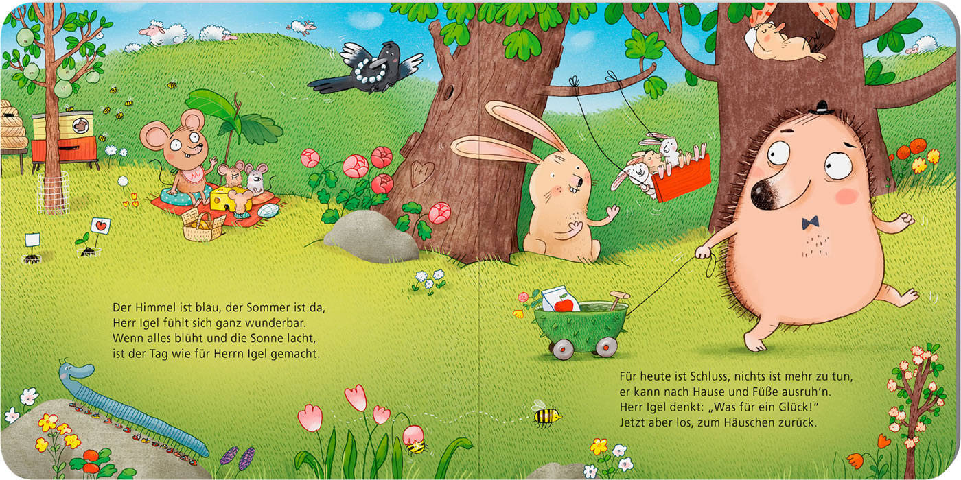 Es ist warm, die Sonne scheint und Herr Igel ist auf dem Weg nach Hause. Dabei trifft er auf so manches Tier und jedes zeigt ihm auf seine Weise, was Glück bedeutet. Herr Igel hört aufmerksam zu – was er wohl als sein größtes Glück empfindet?