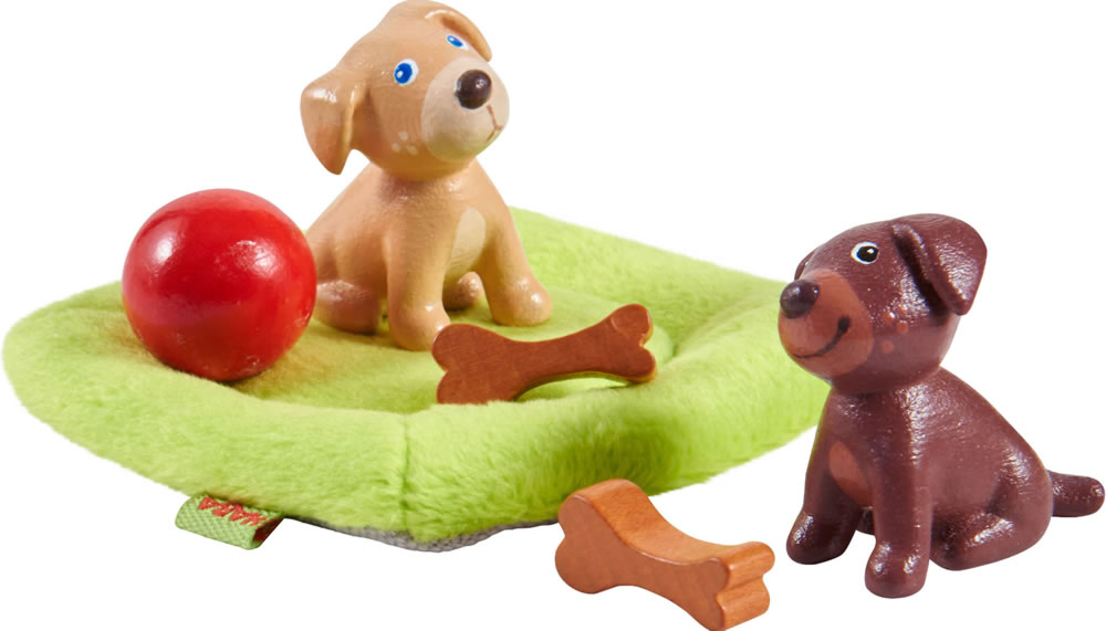 Sind sie nicht süß, die beiden Hundebabys? Am liebsten spielen sie mit ihrem Knochen und mit ihrem Ball. Und alle Little Friends-Biegepüppchen möchten sie streicheln.