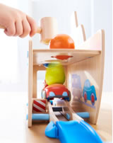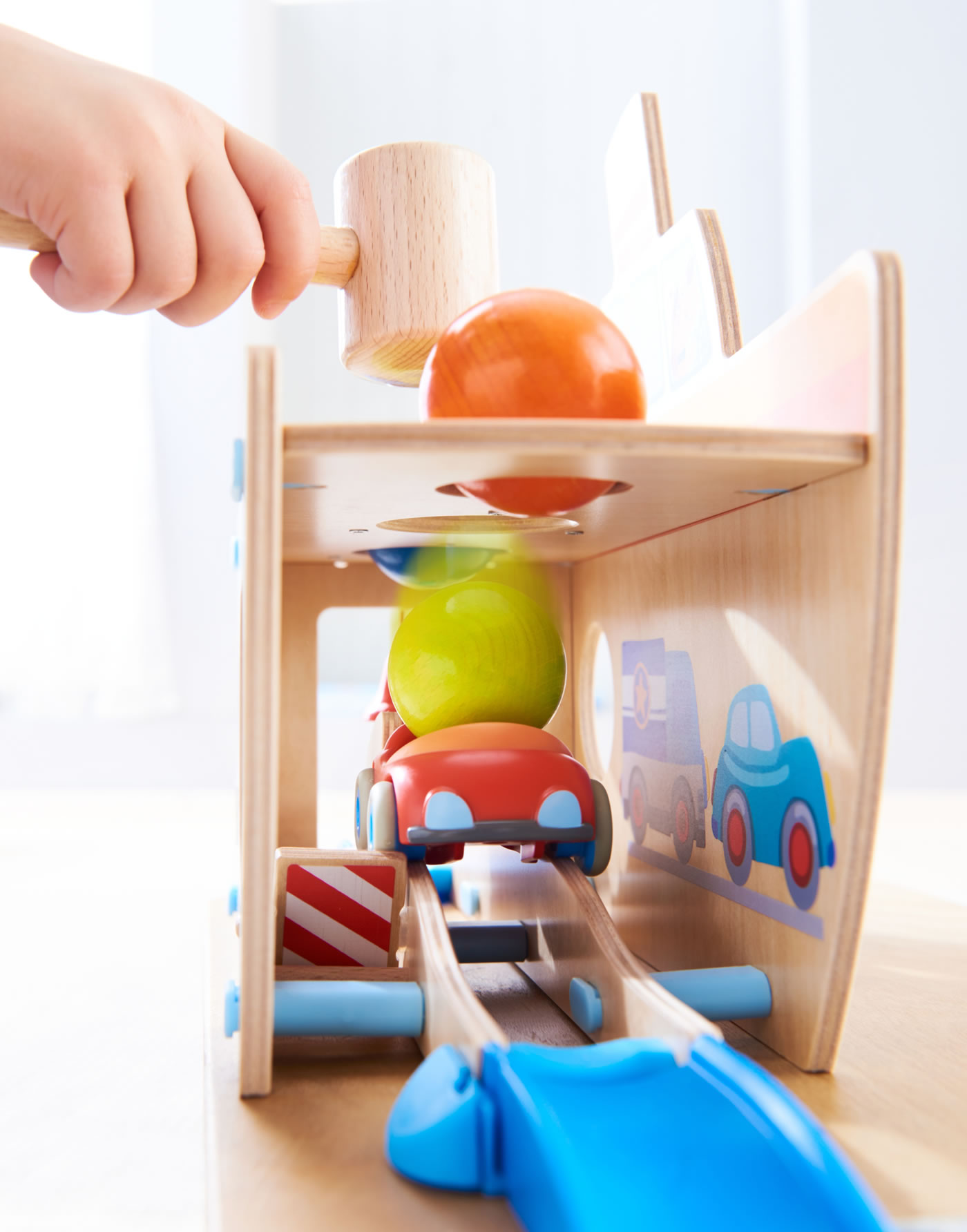 Klopf, klopf, klopf … welche Kugel gehört in welches Loch? Das herauszufinden, macht einfach hammermäßig viel Spaß: Wird die Kugel Kapitän Karl durch den blauen Ring geklopft, läutet sie im Schiffsrumpf ein Glöckchen. Und wenn die grüne Kugel durch das Loch mit dem grünen Ring fluppt, dann plumpst sie direkt in ein schnittiges Kugel-Cabrio, das schon zur Weiterfahrt bereitsteht. So eignet sich die Klopfbank Schiff ahoi nicht nur ideal zum freien Spiel, sondern lässt sich auch perfekt mit anderen Kullerbü-Spielbahnen kombinieren.