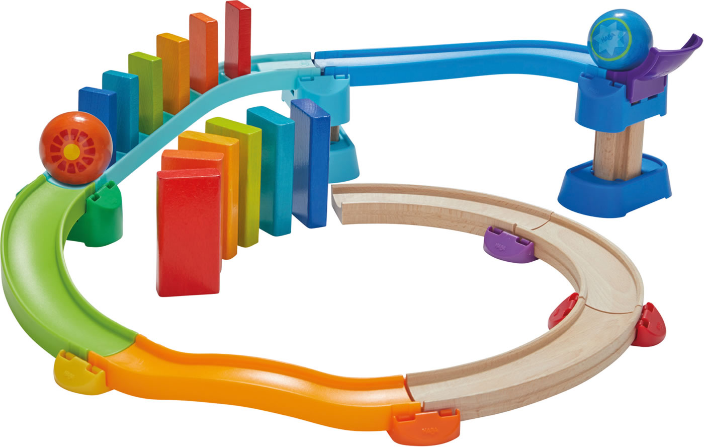 die bunte Kugelbahn Kringel-Domino bringt mit ihren Kurven und Dominosteinen viel Spielspaß nach Kullerbü