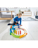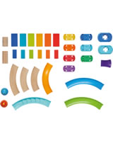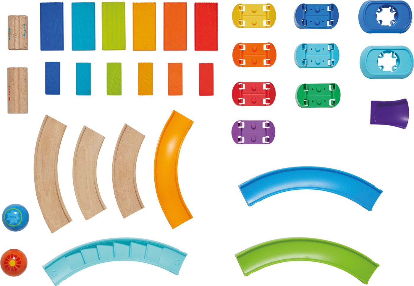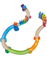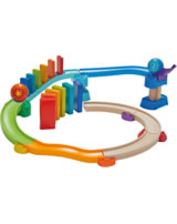 Die bunte Kullerbü-Kugelbahn Kringel-Domino von HABA bringt Kullervergnügen und Domino-Spiel zusammen: Die erste Kugel kullert und, schwups, schon fallen die kleinen Dominosteine auf der Dominotreppe in den schönsten Regenbogenfarben der Reihe nach um – und zwar je nach Aufbau aufwärts oder abwärts. Klick-klack geht es dann die Dominotreppe entlang und mit viel Schwung saust die zweite Kugel anschließend um die Kurven, bevor sie die großen Dominosteine umschubst. Was für ein Spaß, wenn die Dominosteine zu Boden fallen! Dank cleverem Klicksystem ist die Kullerbü-Kugelbahn Kringel-Domino schnell aufgebaut und lädt Kuller-Fans ab 2 Jahren zum lustigen Spielen ein.