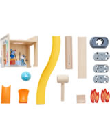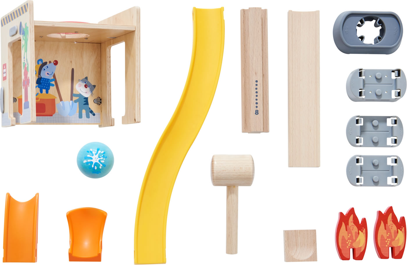 1 Klopfhaus Feuerwehr, 1 Gerade, 1 Säule, 1 Hammer, 1 Startstein, 1 Abfahrtsrampe, 1 Startrampe, 1 Schwungrampe, 2 Feuersteine, 1 Kugel Wasser, 4 Verbindungselemente