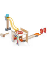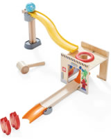 Wenn es in Kullerbü brennt, ist die Feuerwehr immer schnell zur Stelle und dann heißt es „Wasser marsch!“: Die Wasser-Kugel kullert die Rampe hinunter und landet auf dem Dach des Klopfhauses. Wird sie dort mit dem Hammer durch den roten Ring geklopft, saust sie auch schon auf der Geraden weiter, um ruck, zuck die Feuersteine umzuwerfen und den Brand zu löschen.