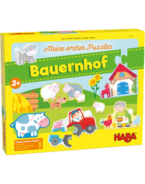 Meine ersten Puzzles – Bauernhof von HABA beinhaltet 5 tierische Motive mit 2, 3 und 4 Puzzleteilen