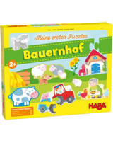 Meine ersten Puzzles – Bauernhof von HABA sorgen bei Kindern ab 2 Jahren für jede Menge Spielfreude. Die großen Puzzleteile sind gut von Kinderhänden zu greifen. 2, 3 oder 4 Puzzleteile ergeben ruck, zuck 5 fröhliche Motive, die verschiedene Bauernhofmotive zeigen: hier ein Pferd, da der Traktor und dort der Stall. Meine ersten Puzzles – Bauernhof von HABA beinhalten zusätzlich eine Holzfigur zum freien Spielen sowie Plättchen zum Zuordnen: Wo wohnt das Pferd? Auf welches Tier passt der Hund auf? Da alle Puzzleteile aus stabiler Pappe verarbeitet sind, ist langer Spielspaß garantiert.