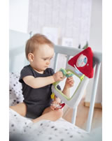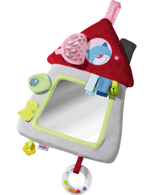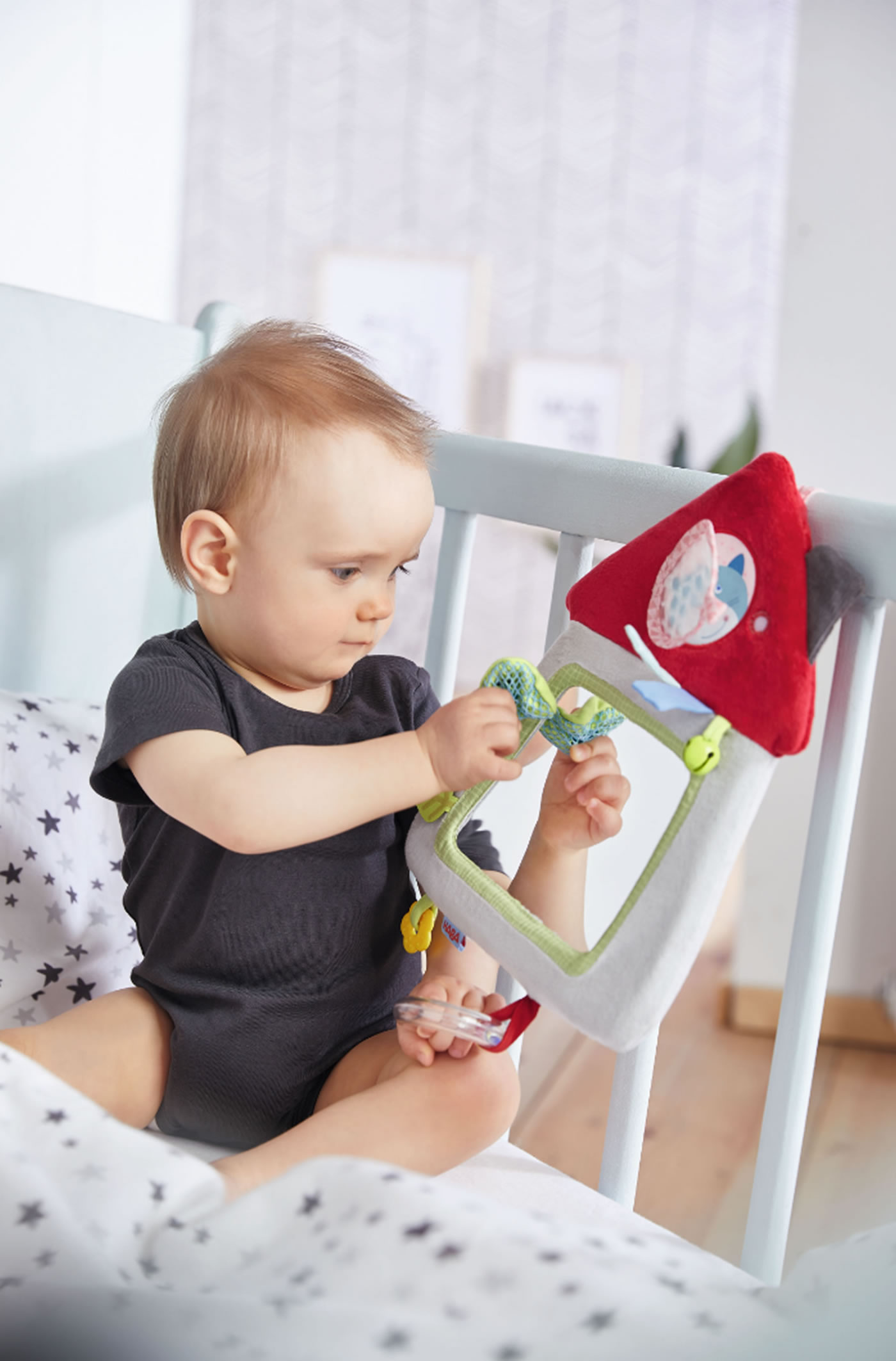 Das HABA Spielkissen Haus lädt Babys zu einer tollen Entdeckungsreise ein. Es ist mit vielen Spielelementen ausgestattet und steckt voller Überraschungen. Öffnet man das Fenster im Dach, spitzt eine Katze heraus. Schaut man in die Spiegelfolie, kann man sich selbst darin sehen. Egal, was man anfasst – überall raschelt, knistert, klingelt oder rasselt es auf wunderbare Weise. Und dann ist das Spielkissen auch noch so schön weich! Babys lieben es, die verschiedenen haptischen und akustischen Elemente zu entdecken. Ruck, zuck lässt sich das HABA Spielkissen Haus an der Babyschale, dem Kinderwagen oder dem Kinderbett befestigen und bietet den Jüngsten ab 6 Monaten daheim und unterwegs einen spannenden Zeitvertreib.
