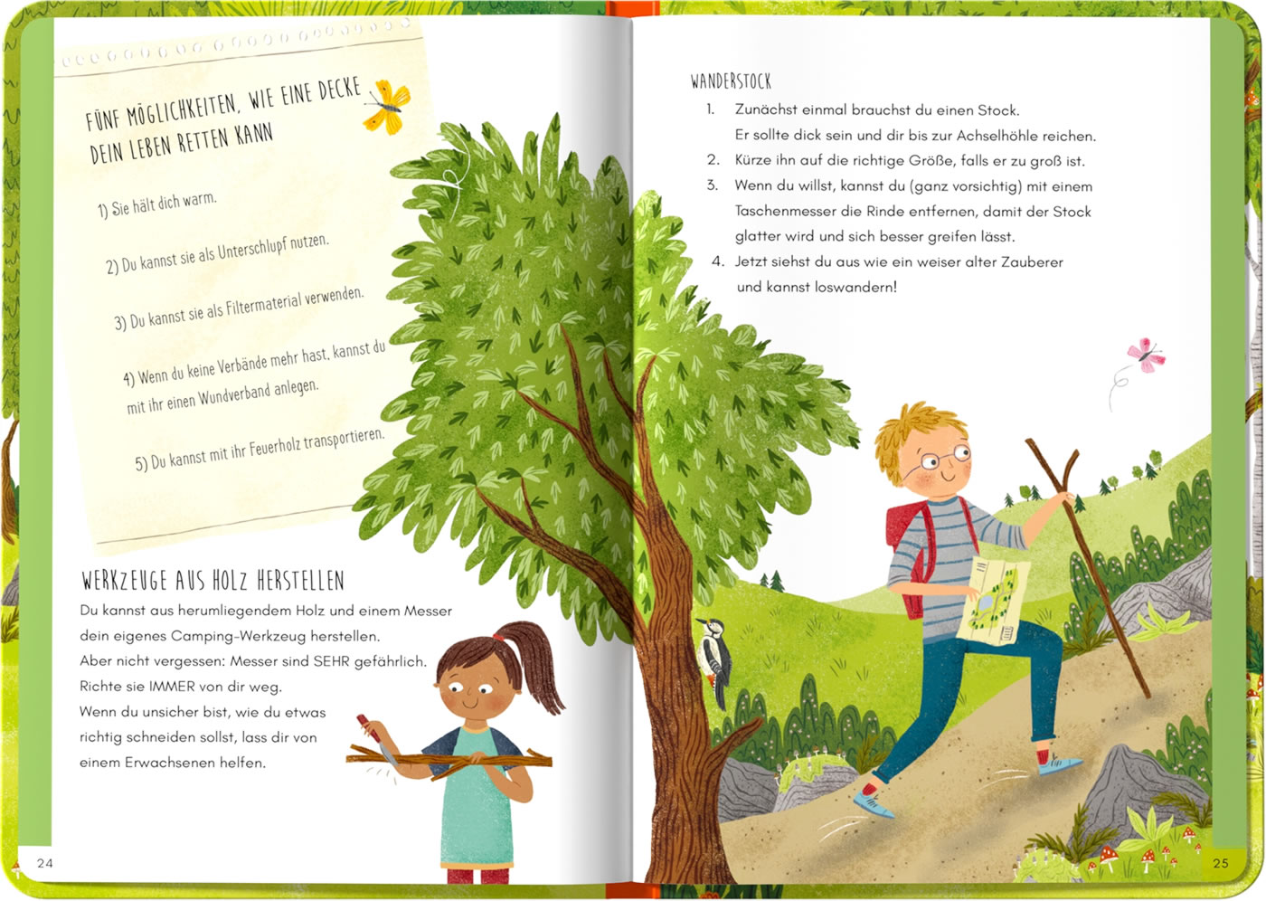 Wer ist bereit, Abenteuer im Wald zu erleben? Dieses Outdoor-Handbuch zeigt Kindern alles, was sie dafür wissen müssen: Wie sie einen Unterstand errichten, was ihnen die Hinterlassenschaften von Tieren sagen und wie sie einen Kompass lesen. Sie erfahren sogar, wie sie aus ihrem eigenen Urin Trinkwasser gewinnen können! Und auch, was sie im Wald auf keinen Fall tun dürfen, wird thematisiert, z. B. giftige Pilze essen oder einen Waldbrand auslösen. Gut ausgerüstet mit viel Expertenwissen und jeder Menge Tipps und Tricks kann es losgehen: Auf ins Abenteuer!