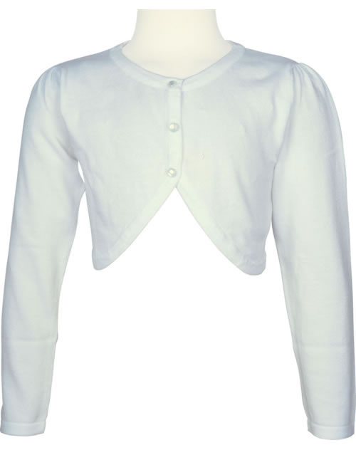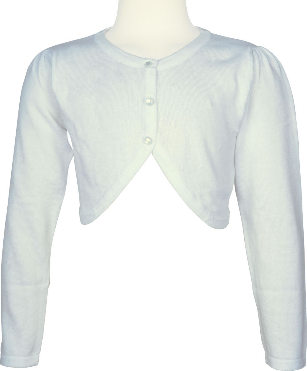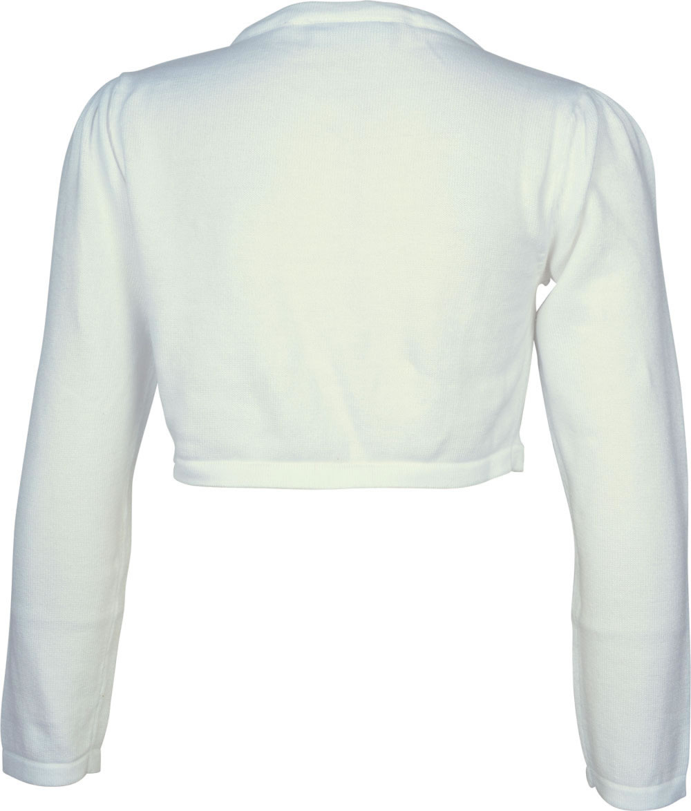 Hübsche creme weiße Feinstrick-Bolerojacke zur Kommunion oder anderen festlichen Anlässen von HAPPY GIRLS by E-GIRLS. Der Ausschnitt ist betont rund geschnitten und mit drei perlmuttfarbenen Knöpfen zu schliessen. Das angenehme Material sorgt für einen hohen Tragekomfort.