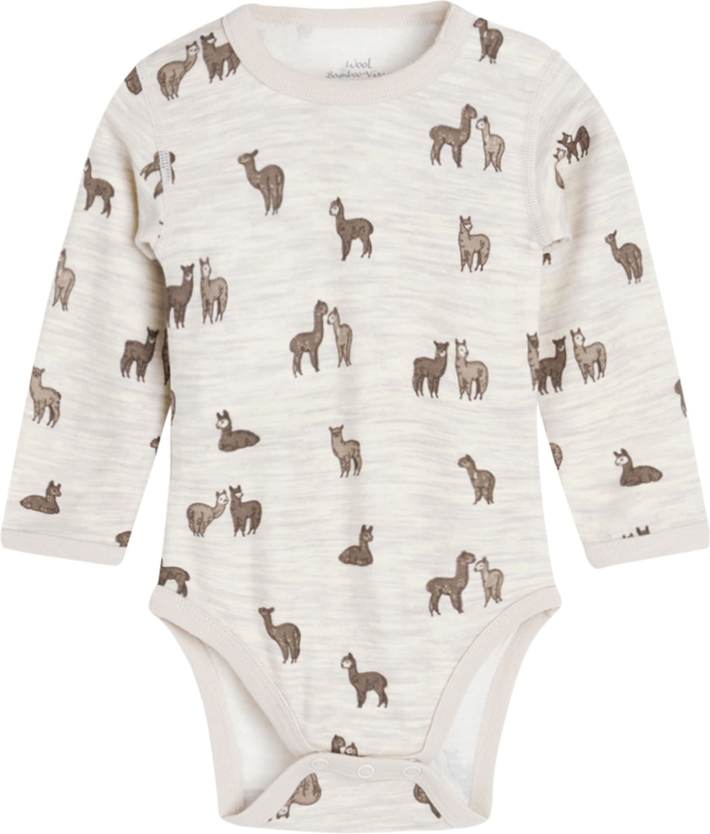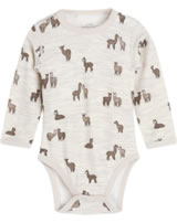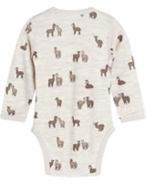 Body mit langen Ärmeln von HUST AND CLAIRE. Im Schritt und auf der linken Schulter befinden sich Druckknöpfe, die beim An- und Ausziehen helfen. Durch den hohen Wollanteil hält der Body schön warm und die Viskose aus Bambus sorgt für ein angenehmes Tragegefühl. Besonders schön sind die kleinen Lamas, die sich auf dem Body tummeln.