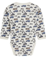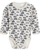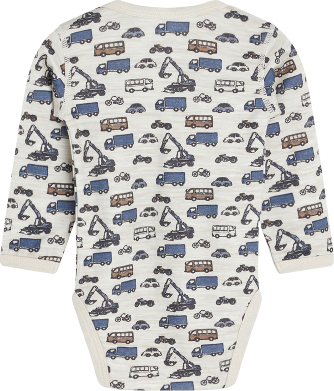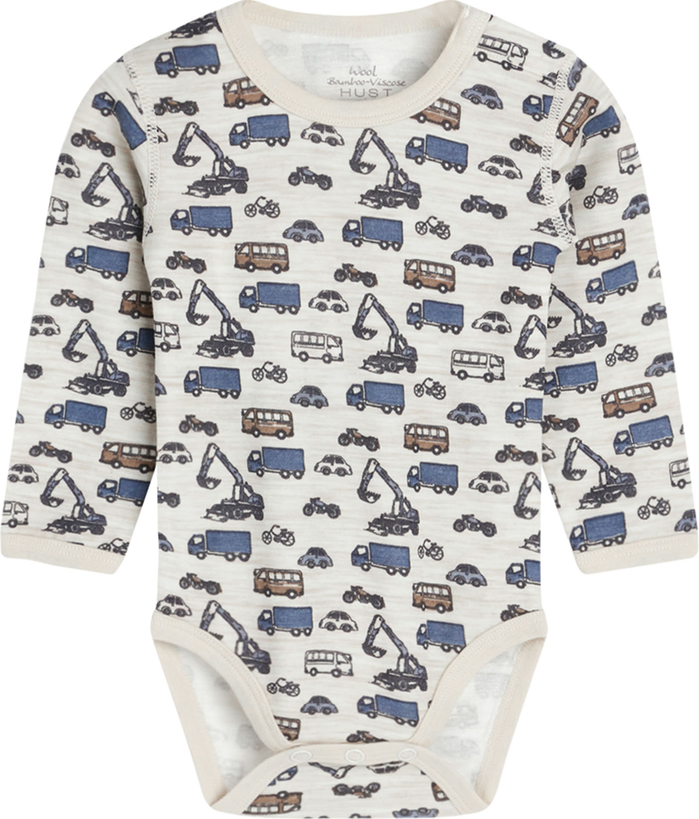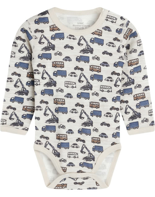 Body mit langen Ärmeln von HUST AND CLAIRE. Im Schritt und auf der linken Schulter befinden sich Druckknöpfe, die beim An- und Ausziehen helfen. Durch den hohen Wollanteil hält der Body schön warm und die Viskose aus Bambus sorgt für ein angenehmes Tragegefühl. Ein besonders schönes Detail sind die Fahrzeuge, die sich auf dem Body tummeln.