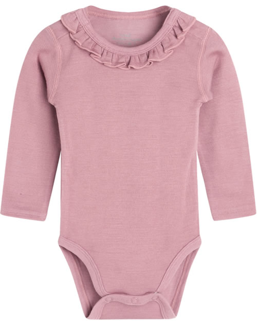 Body mit langen Ärmeln für Mädchen von HUST AND CLAIRE. Im Schritt und auf der linken Schulter befinden sich Druckknöpfe, die beim An- und Ausziehen helfen. Durch den hohen Wollanteil hält der Body schön warm und die Viskose aus Bambus sorgt für ein angenehmes Tragegefühl. Ein schönes Detail ist der gerüschte Kragen.