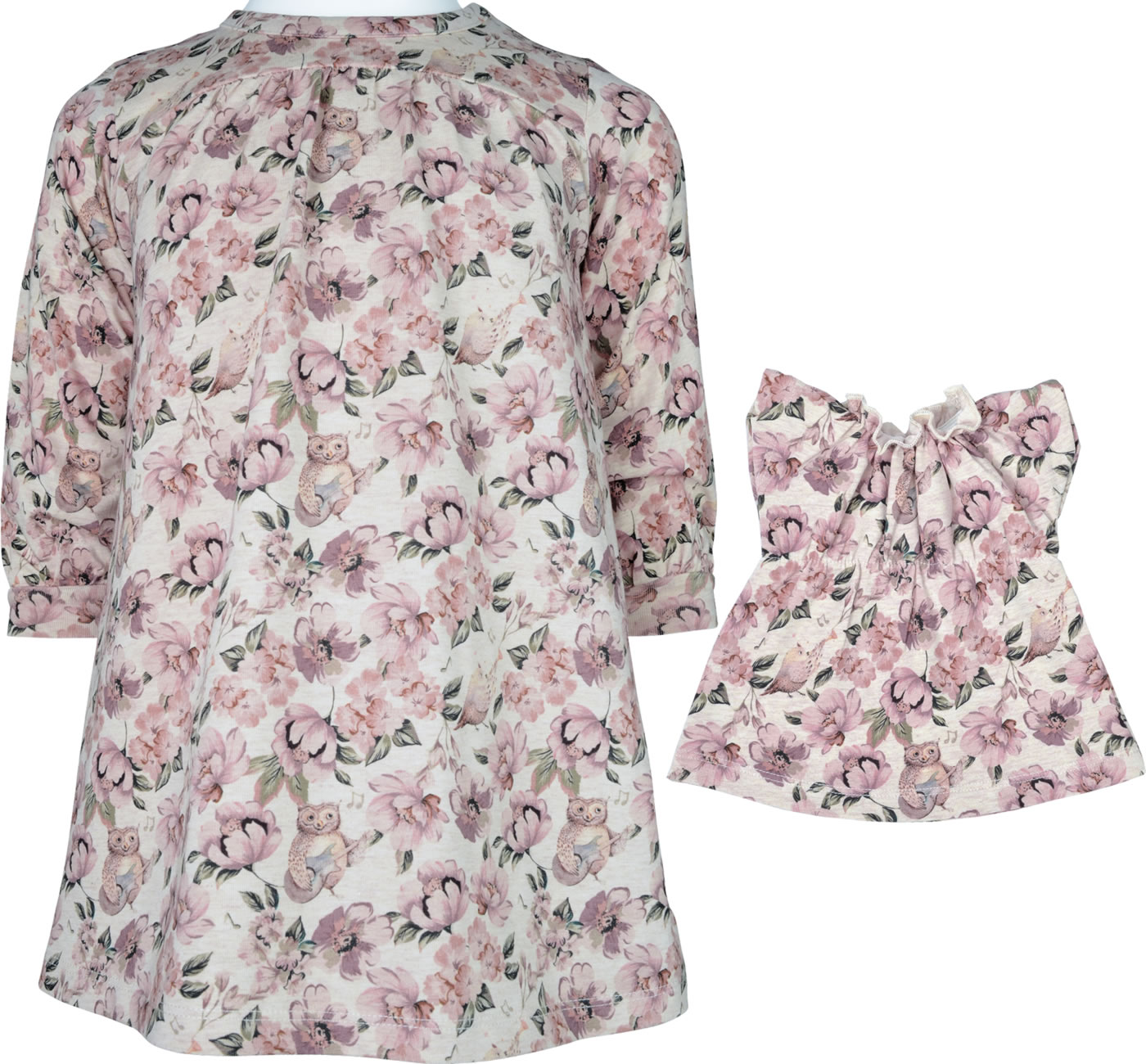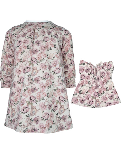 Locker geschnittenes Kleid mit langen Ärmeln von HUST AND CLAIRE. Besonders hübsch ist das nostalgische Muster mit Blumen und kleinen Igeln. Das Material aus ökologisch hergestellter Baumwolle und der weite Schnitt sorgen für einen hohen Tragekomfort. Das Kleid lässt sich prima mit Leggings oder Strumpfhose kombinieren. Passend dazu gibt es für den Teddy oder die Puppe das Kleid in Mini.