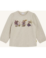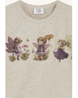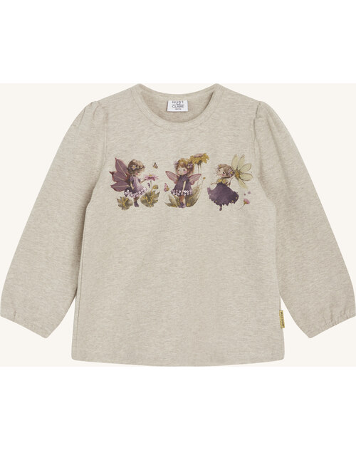 Langarmshirt aus weicher Baumwolle mit Feen- Print auf der Brust. Die Feen sind mit hübschen Details wie Glitzer, Tüll und Pailletten verziert. Dieses Modell hat Faltendetails an den Schultern und elastische Ärmelabschlüsse.