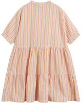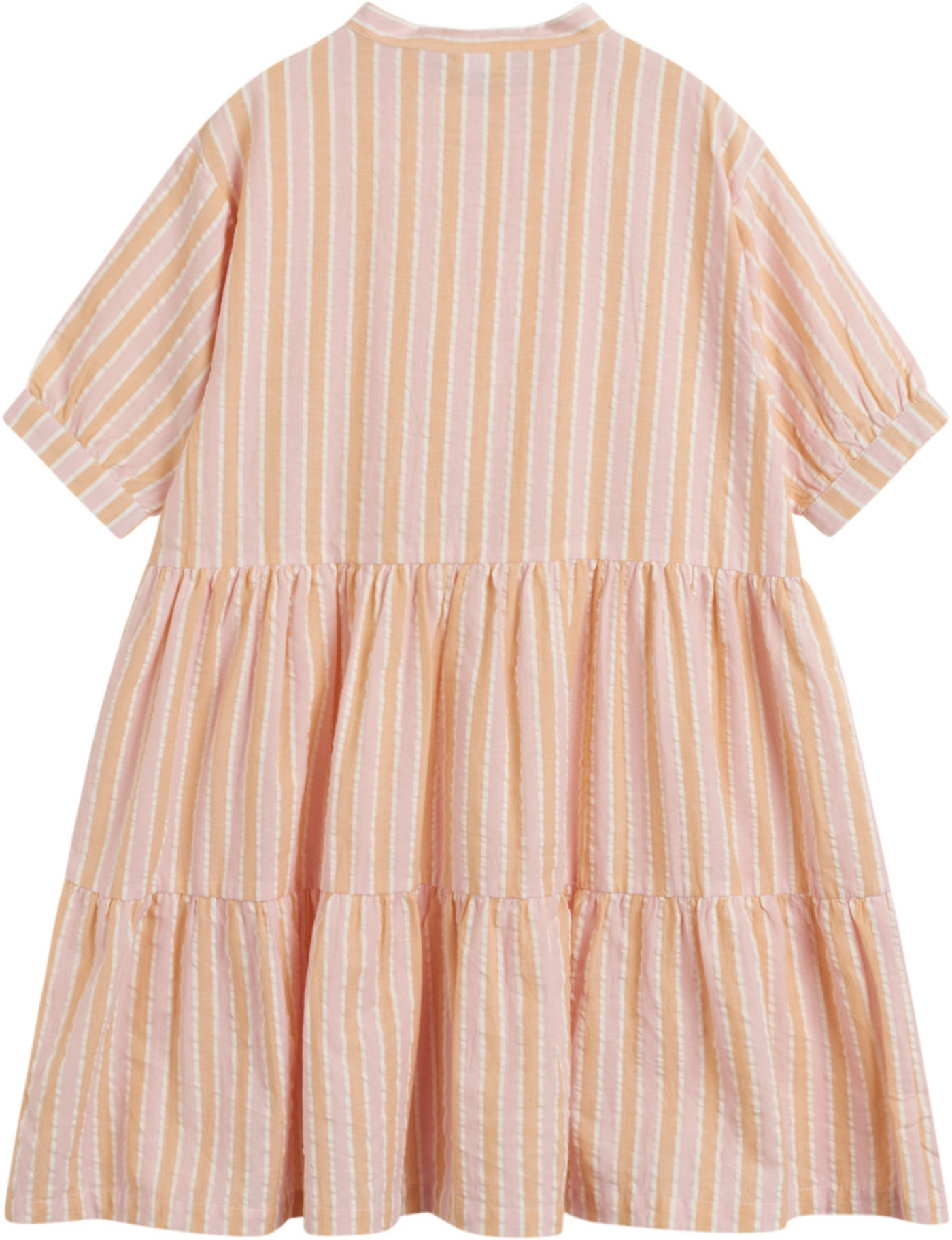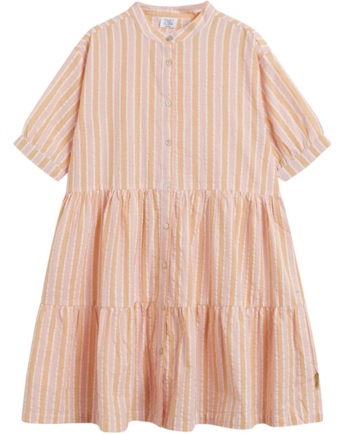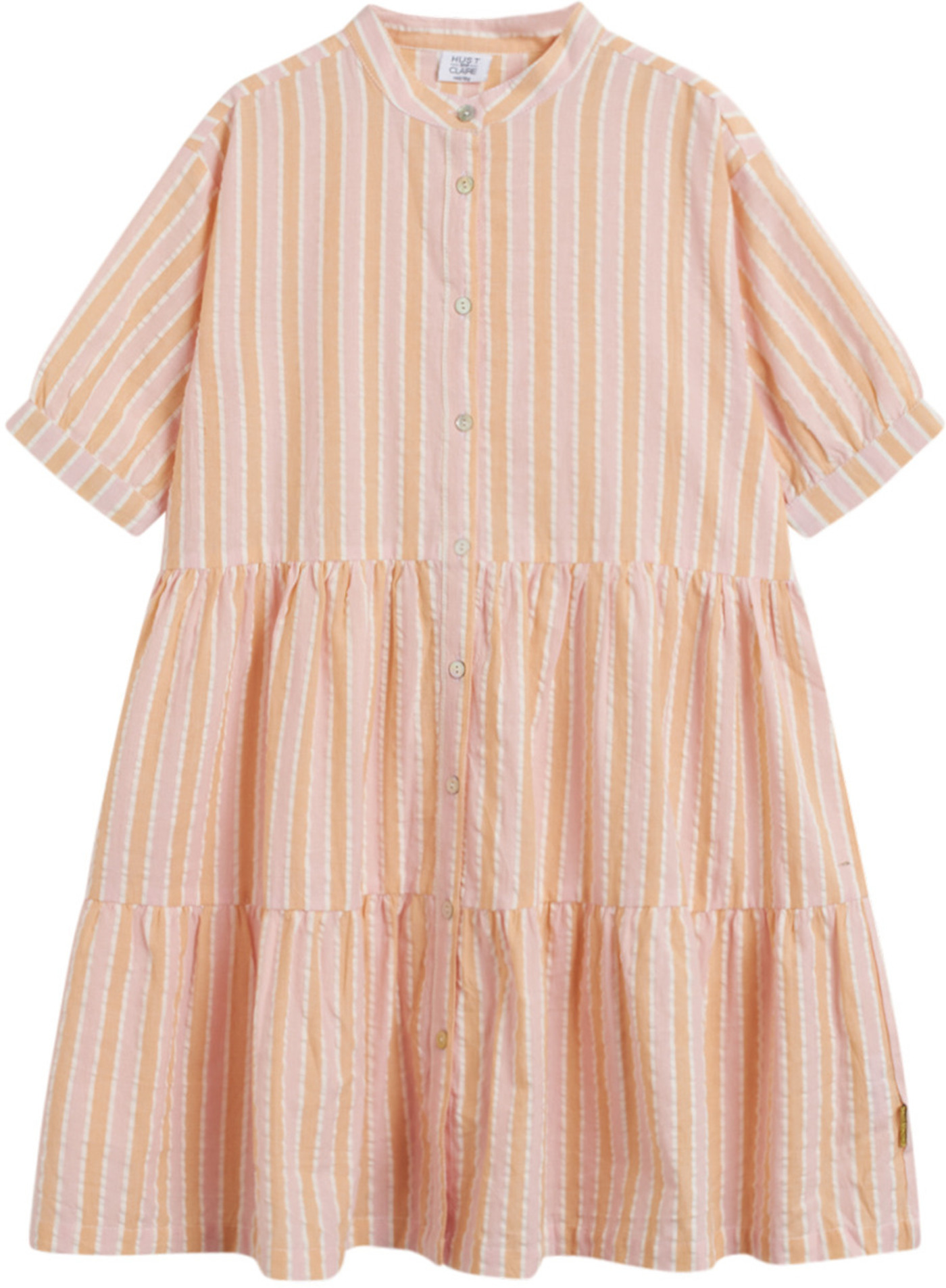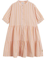 Sommer-Kleid mit kurzen Ärmeln von HUST AND CLAIRE. Der feste Baumwollstoff ist ideal für warme Tage. Das Kleid hat einen weiten Schnitt und bietet viel Bewegungsfreiheit. Verschlossen wird es mit einer Knopfleiste auf der Vorderseite. Schöne Details sind die zarten Streifen, der Stehkragen und die gerafften Ärmel.