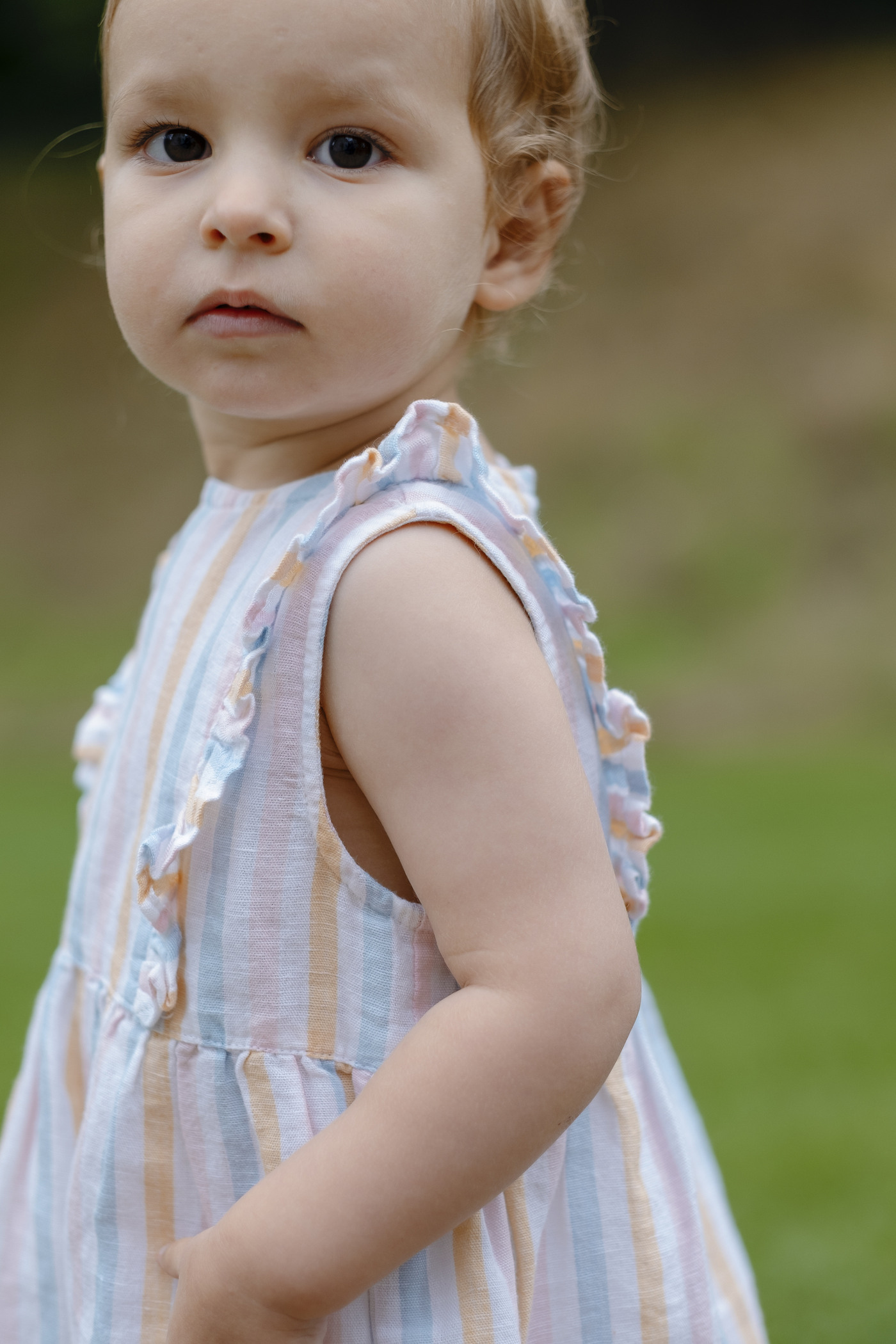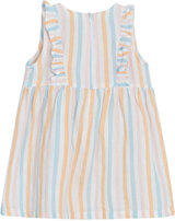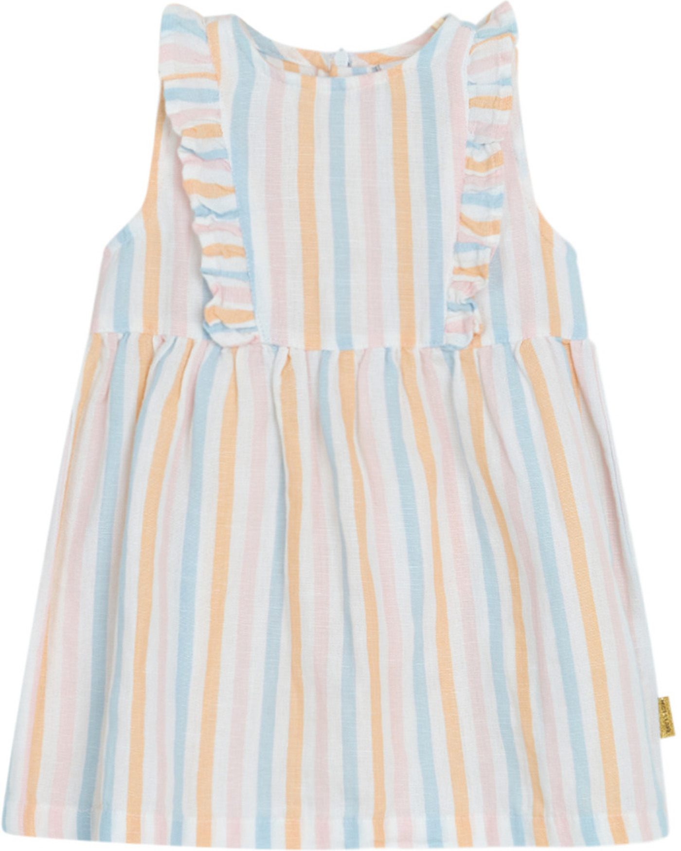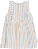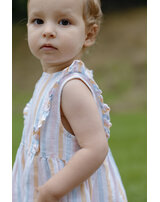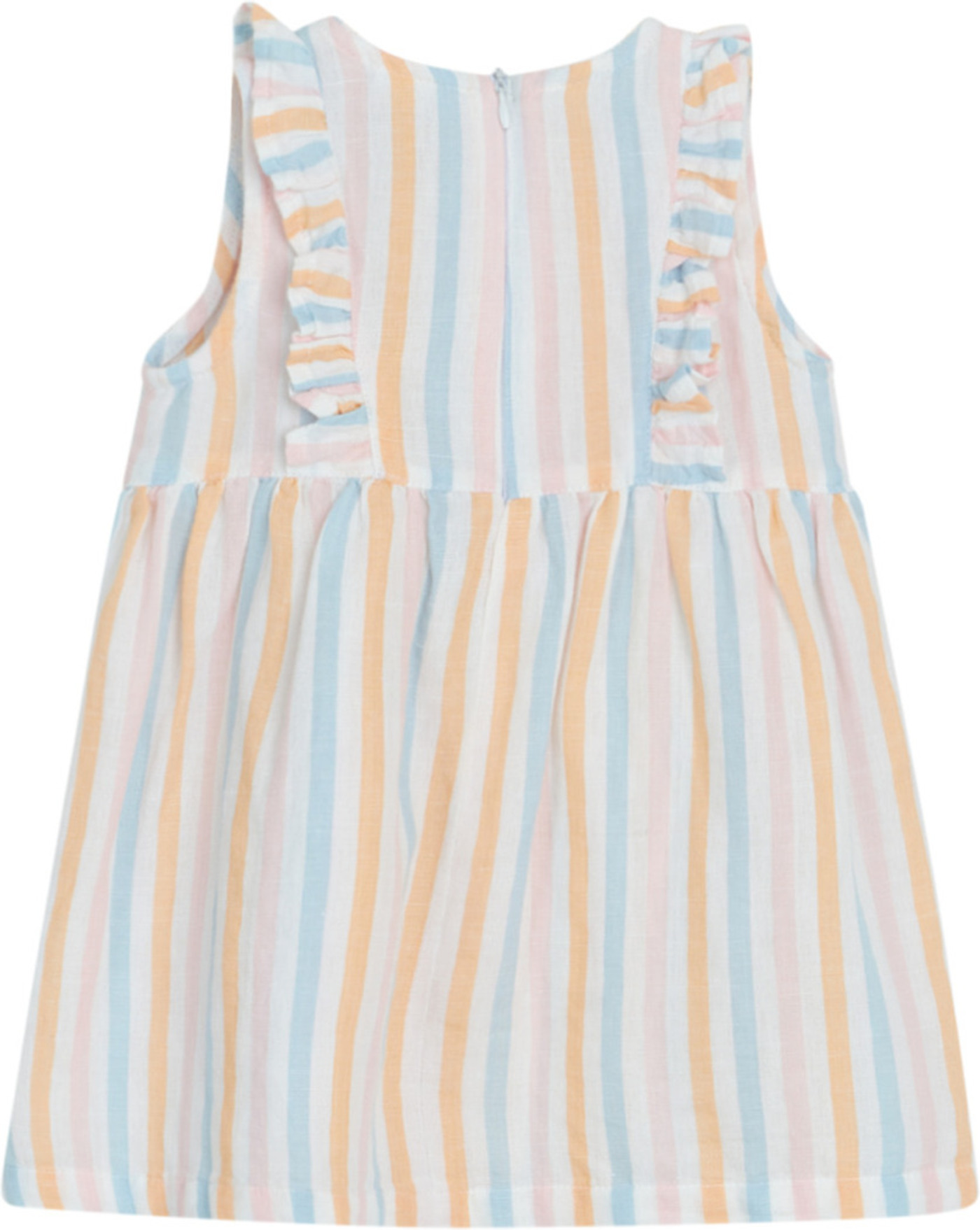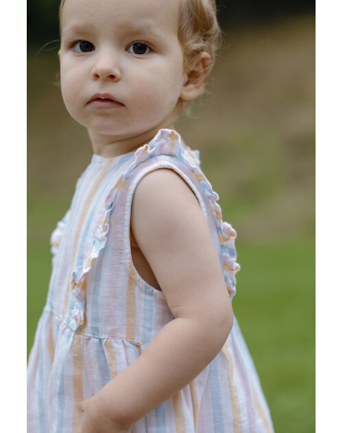 Ärmelloses Sommer-Kleid von HUST AND CLAIRE. Der feste Baumwollstoff mit Leinenanteil ist ideal für warme Tage. Das Kleid hat einen lockerren Schnitt und bietet viel Bewegungsfreiheit. Verschlossen wird es mit einem Reßverschluss auf der Rückseite. Besonders schöne Details sind die zarten Streifen und die Rüschen, die über Vorder- und Rückseite laufen.