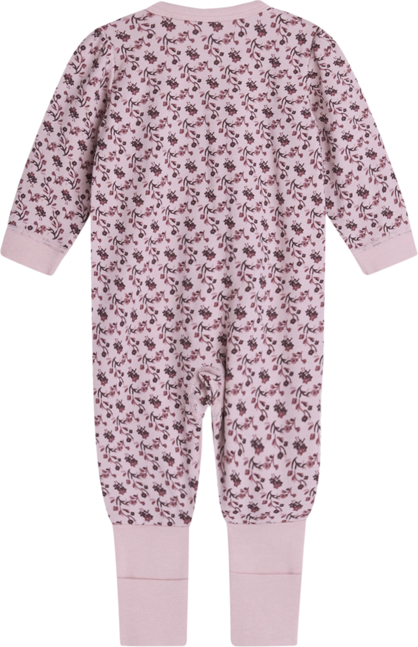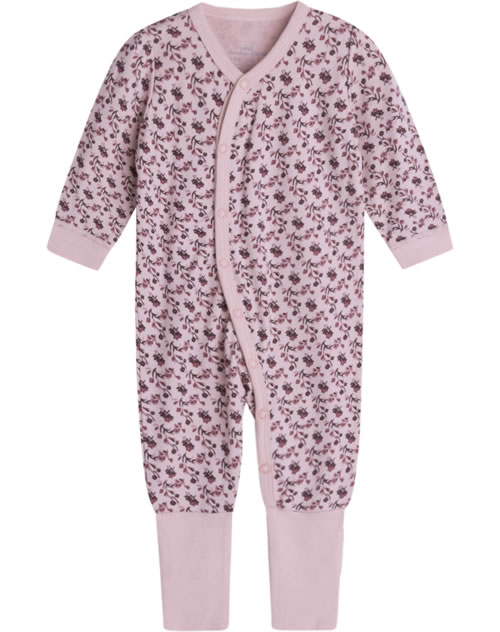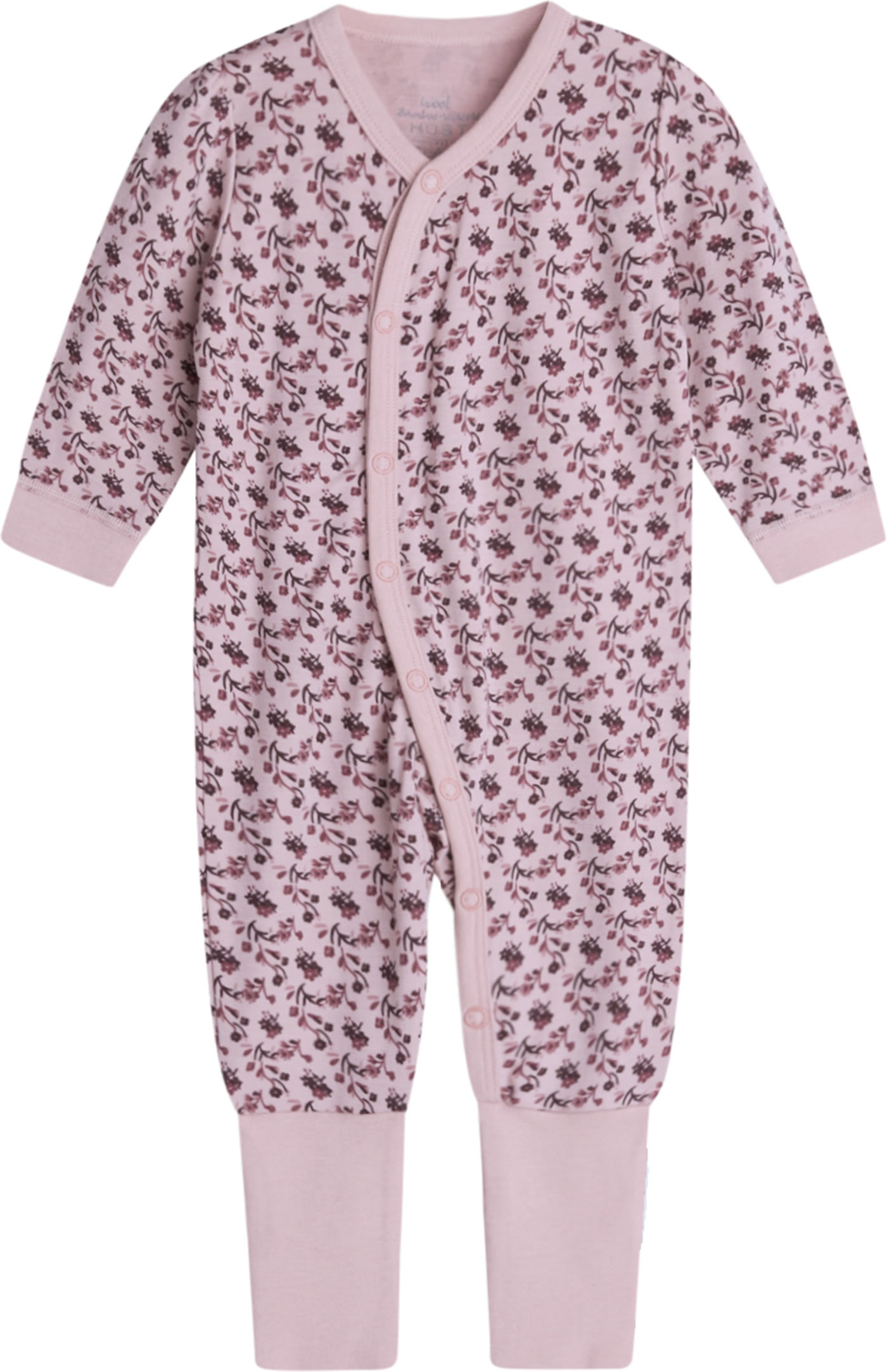 Geblümter Strampler mit langen Ärmeln für Mädchen von HUST AND CLAIRE. Die durchgehnede Druckknopfleiste hilft beim An- und Ausziehen. Durch den hohen Wollanteil hält der Strampler schön warm und die Viskose aus Bambus sorgt für ein angenehmes Tragegefühl. Die Beinenden lassen sich umstülpen, da bleiben die Füße schön warm.