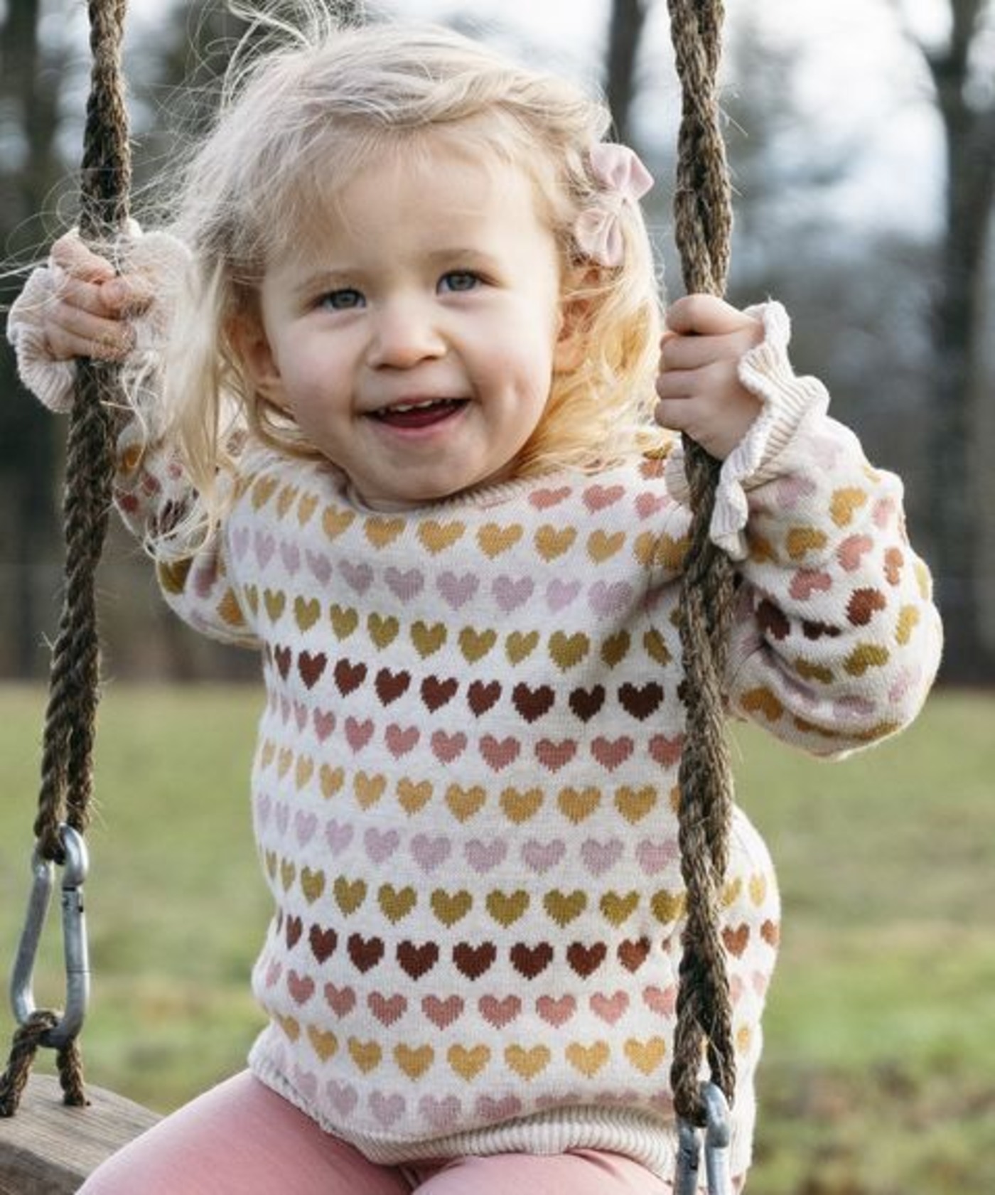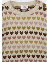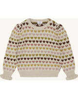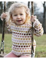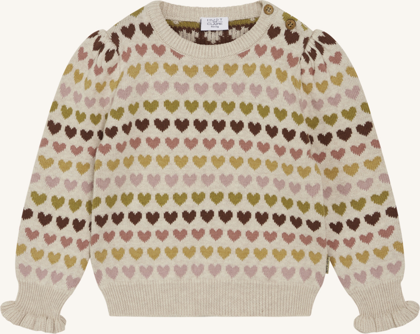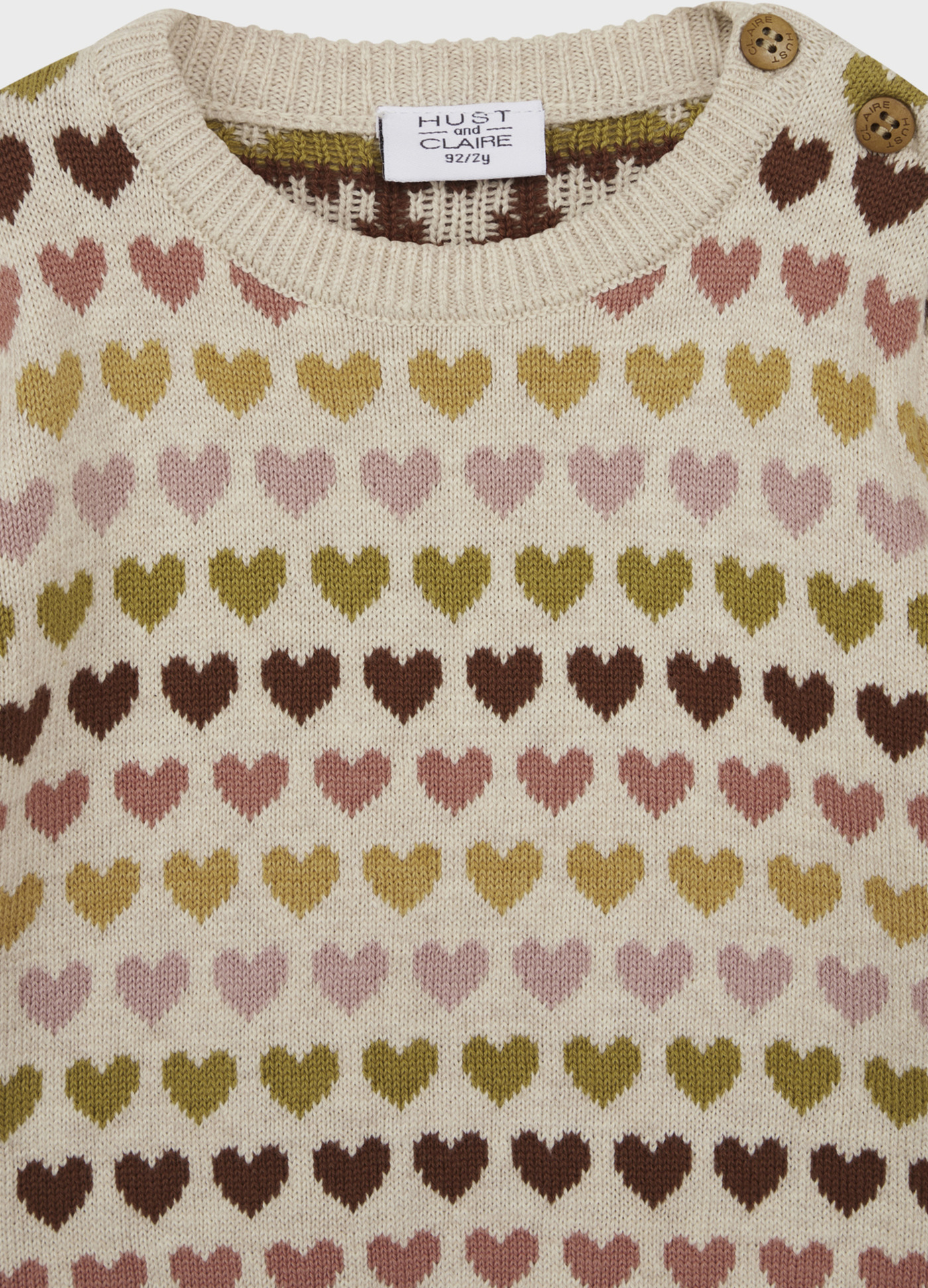 Schöner Strick-Pullover für Mädchen von HUST AND CLAIRE. Der lockere Schnitt bietet viel Bewegungsfreiheit. Das Design aus bunten Herzen und Knopfleiste auf der Schulter lässt den Pullover schnell zu einem Lieblingsstück werden. Besondere Details sind die Bündchen an den Ärmeln. Ab der Größe 134 befindet sich keine Knopfleiste mehr am Halsausschnitt.