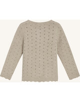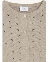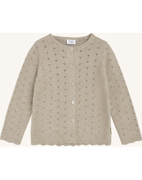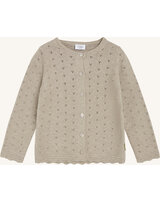 Cardigan aus weicher Baumwolle mit Lochmuster. Dieses Modell hat einen hübschen gewellten Rand an den Ärmeln und am unteren Saum der Strickjacke, sowie vorne einen Knopfverschluss. Dieses Produkt ist aus 100 % Bio-Baumwolle hergestellt