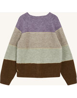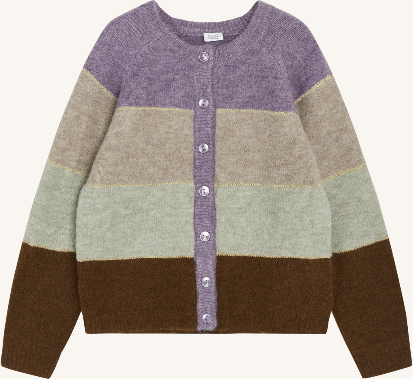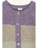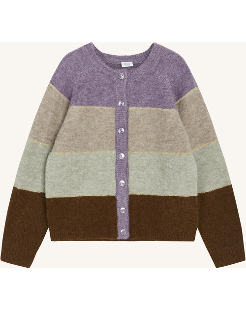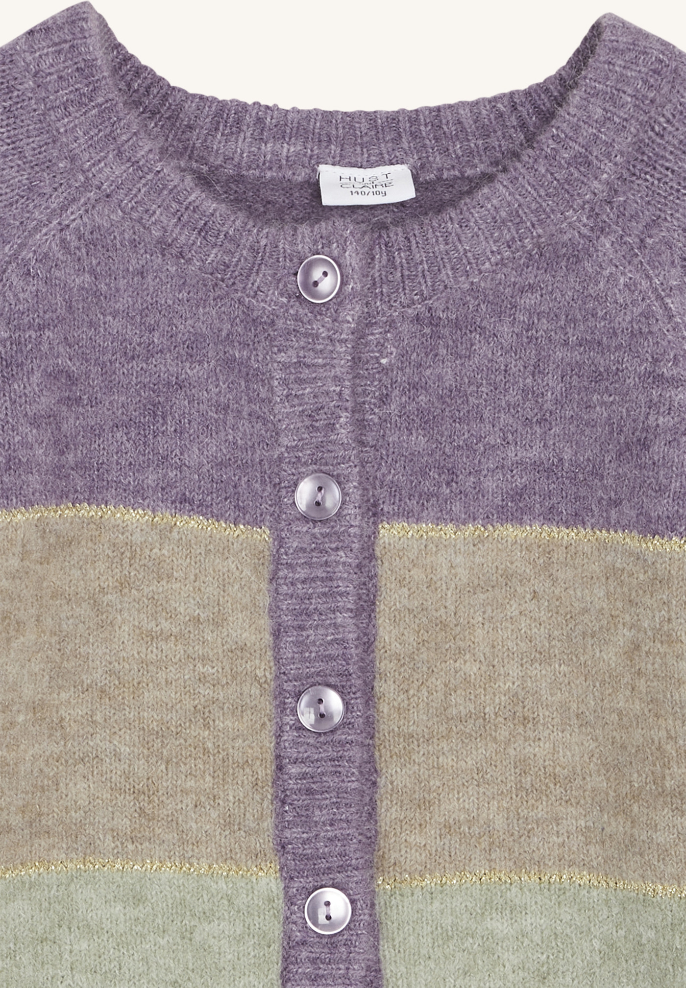 Breit gestreifte Strickjacke aus weichem Mohair. Dieses Modell besitzt hübsche Glitzerstreifen und Knöpfe entlang der Vorderseite.