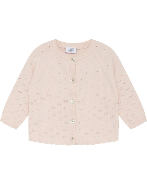 Schöne Strickjacke für Mädchen von HUST AND CLAIRE. Verschlossen wird die Strickjacke mit schimmernden Knöpfen. Besonders schön ist das Lochmuster und die hübschen Säume