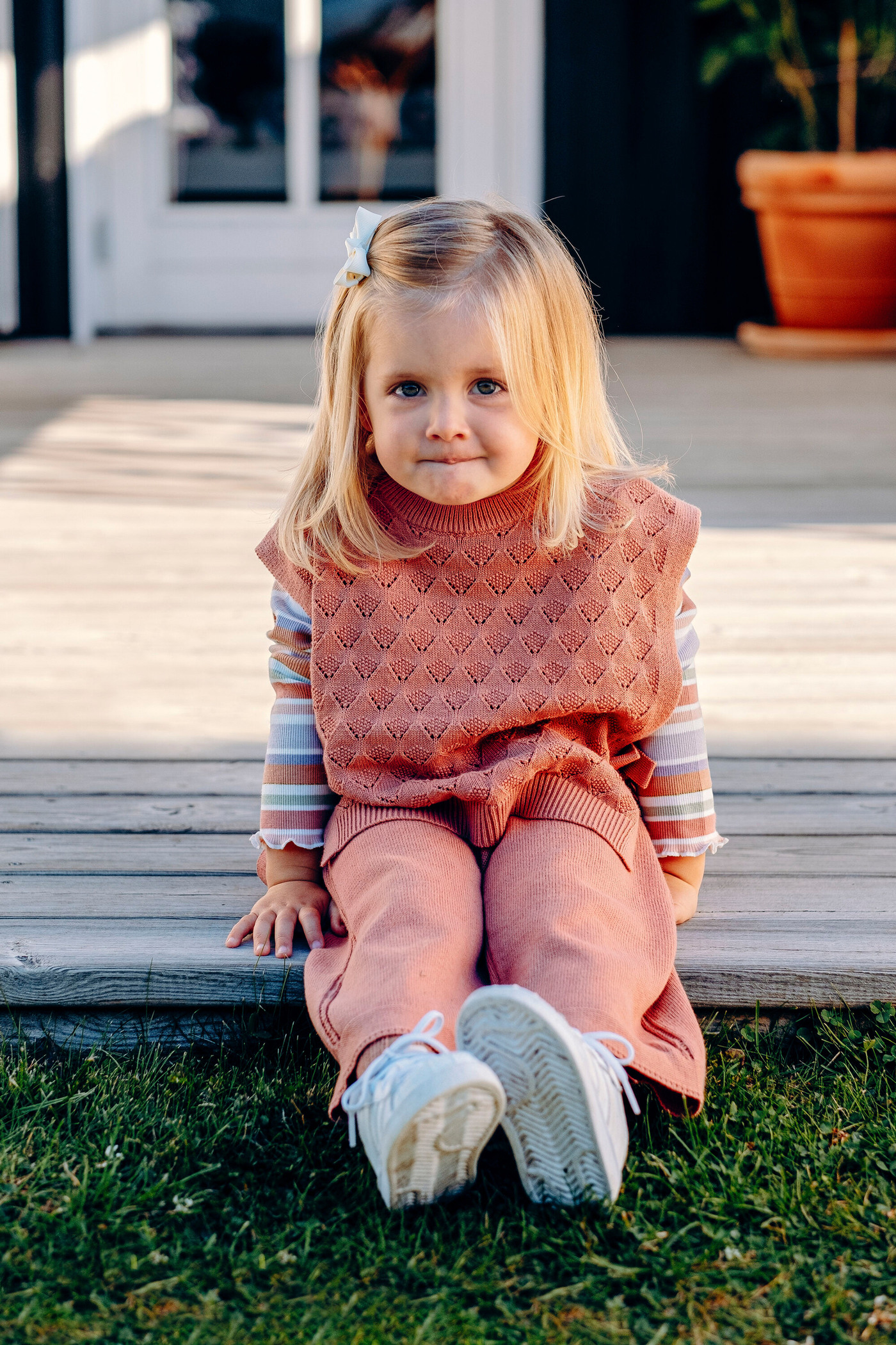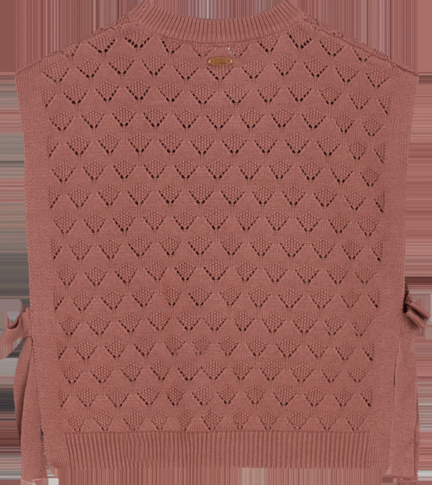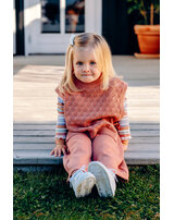 Schöne Strickweste mit Lochmuster für Mädchen von HUST AND CLAIRE. Die Weste ist seitlich offen und nur mit einer festen Schleife verschlossen. So ist für Bewegungsfreiheit gesogt. Hinten ist die Weste etwas länger geschnitten. Das angenehme Material bietet einen hohen Tragekomfort.
