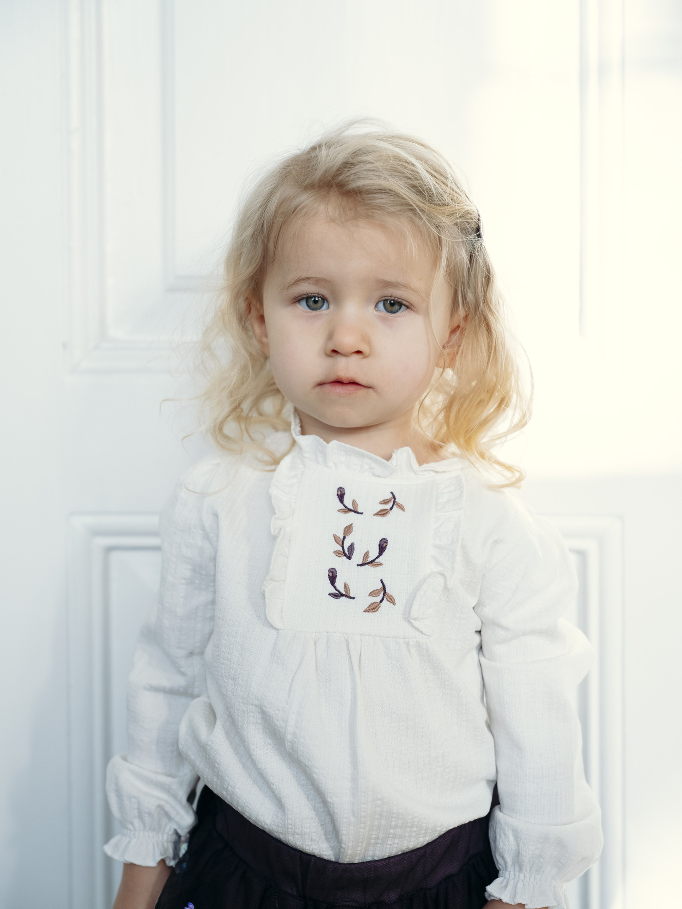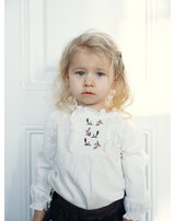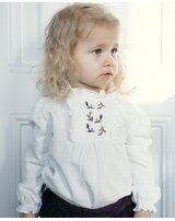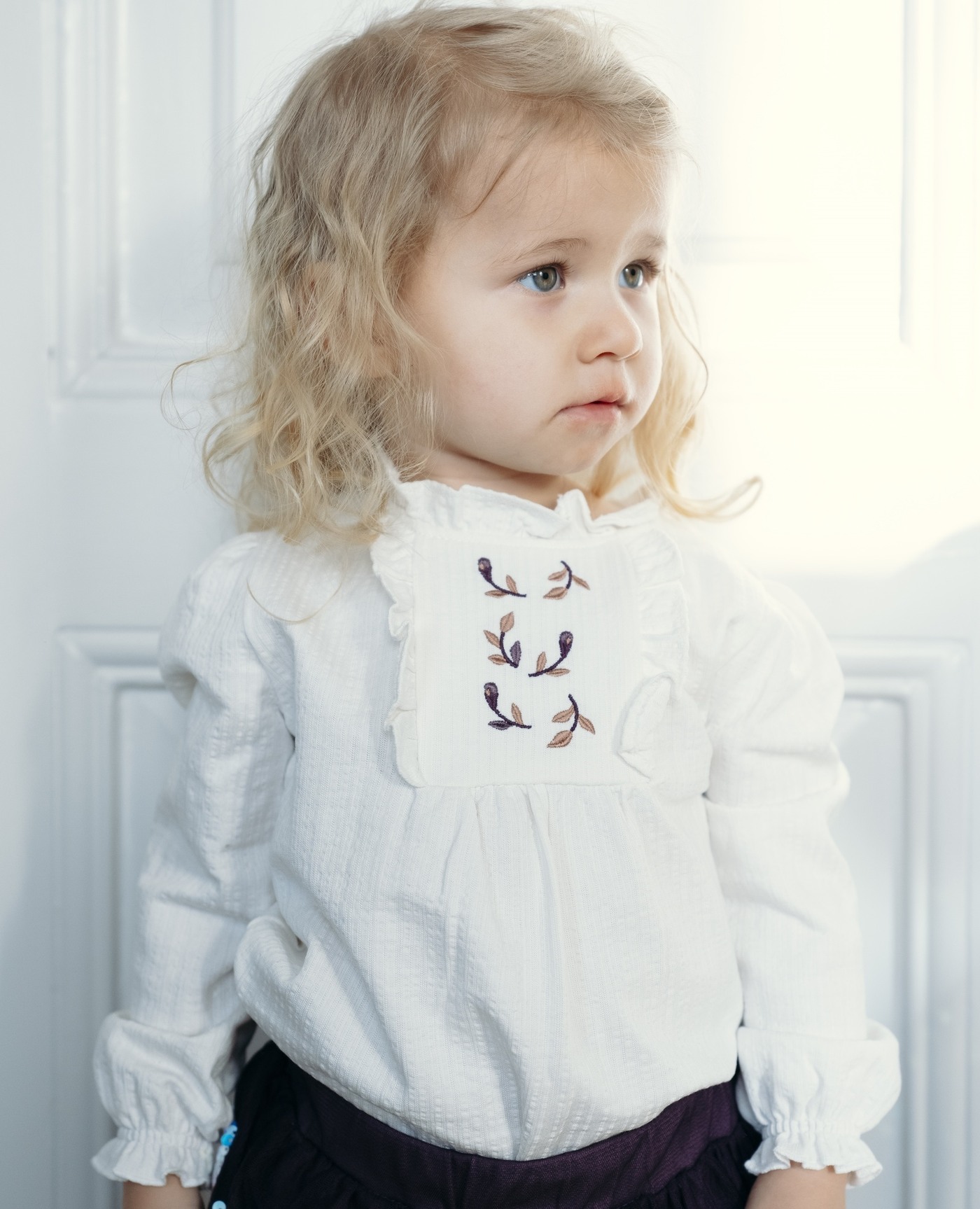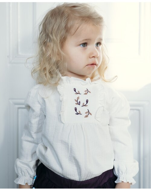 Langarmshirt aus strukturiertem Jersey mit aufgestickten Blättern auf der Brust. Dieses Modell verfügt über Rüschenbesatz am Kragen und auf der Brust. Dieses Modell hat Faltendetails an den Schultern und elastische Ärmelabschlüsse.