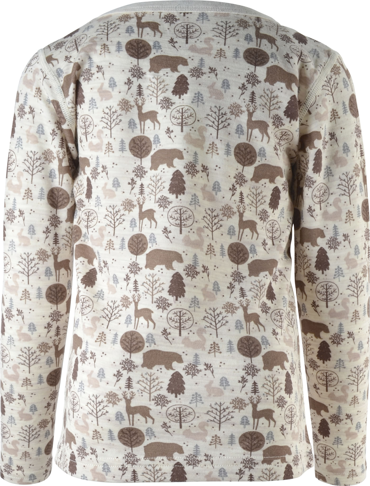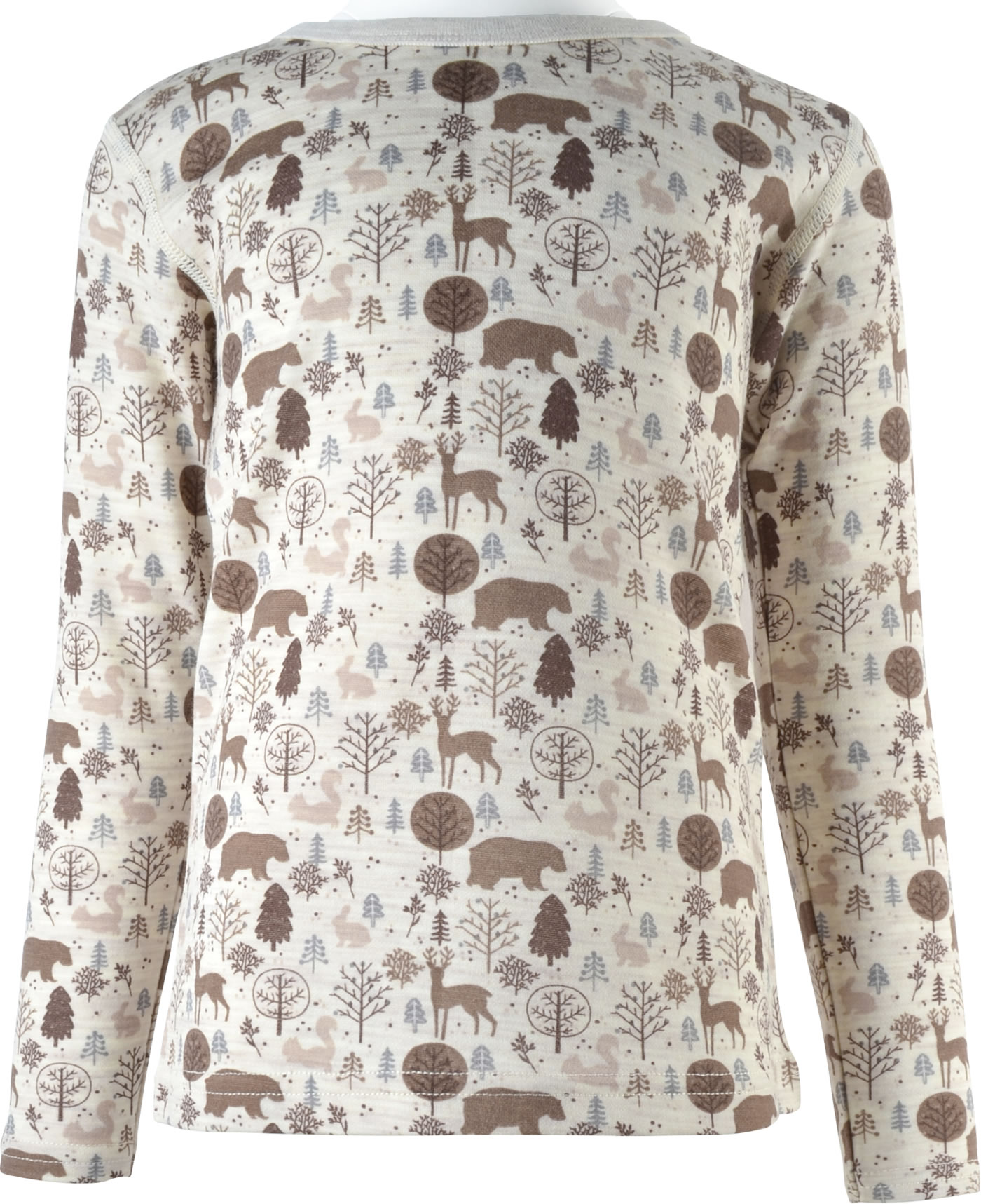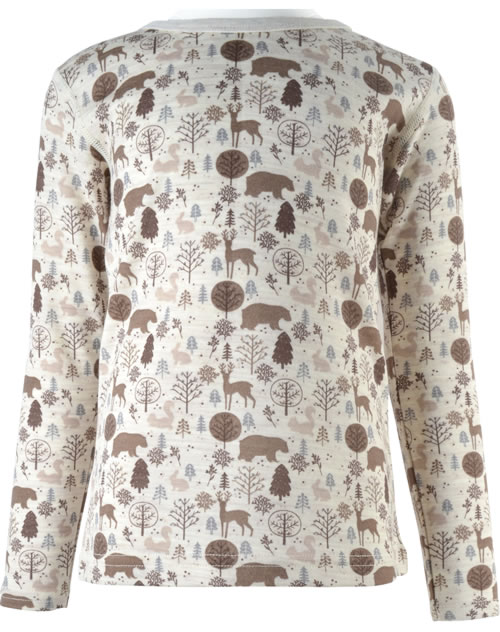 T-Shirt mit langen Ärmeln von HUST AND CLAIRE. Durch den hohen Wollanteil hält das Shirt schön warm und die Viskose aus Bambus sorgt für ein angenehmes Tragegefühl. Ein toller Hingucker ist das Waldmotiv mit den vielen Tieren und Bäumen.