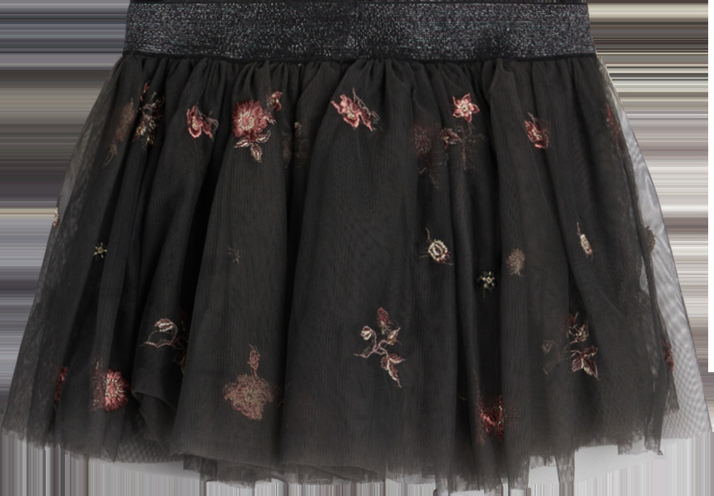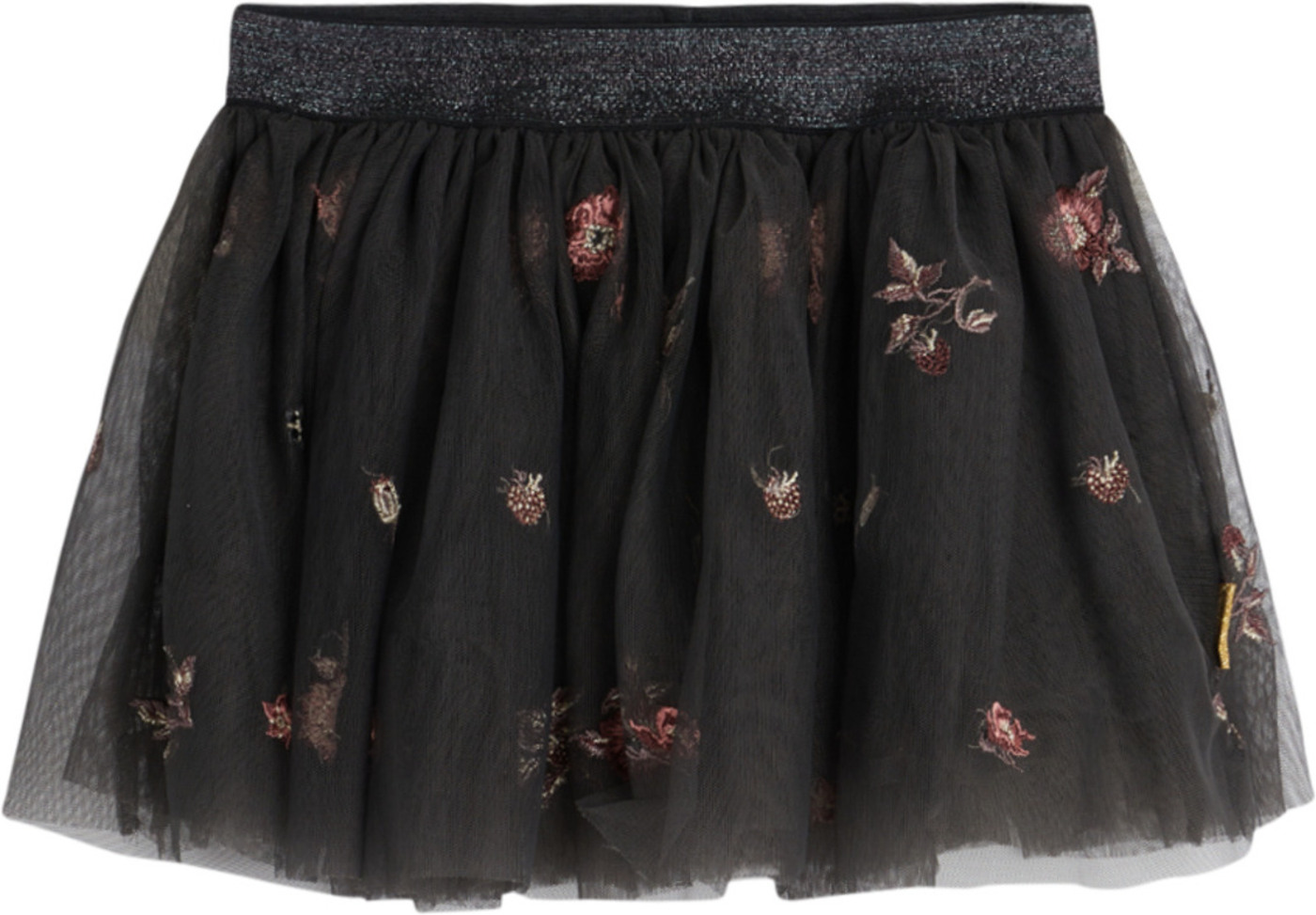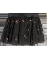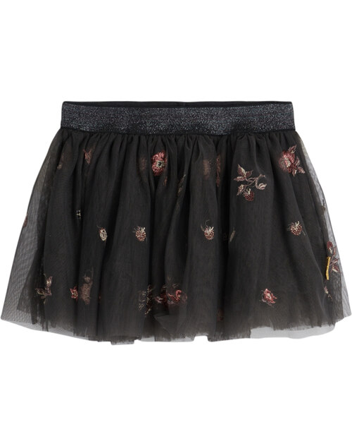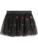 Weit schwingender Rock von HUST AND CLAIRE. Der Rock besteht aus zweii Lagen aus dünnem Tüll und einem Futter aus weichem Baumwoll-Jersey. Das gold glitzernde Bündchen sorgt für einen perfekten Sitz. Besonders schöne Details sind die bunten gestickten Blumen mit Glitzerfäden.