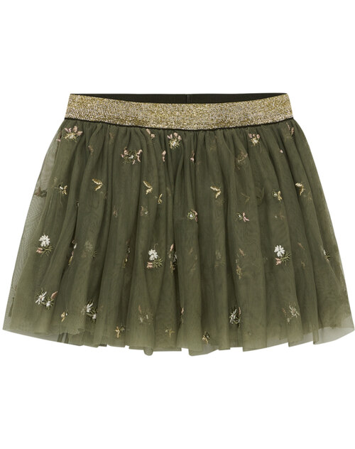 Das gold glitzernde Bündchen sorgt für einen perfekten Sitz. Besonders schöne Details sind die bunten gestickten Blumen mit Glitzerfäden.