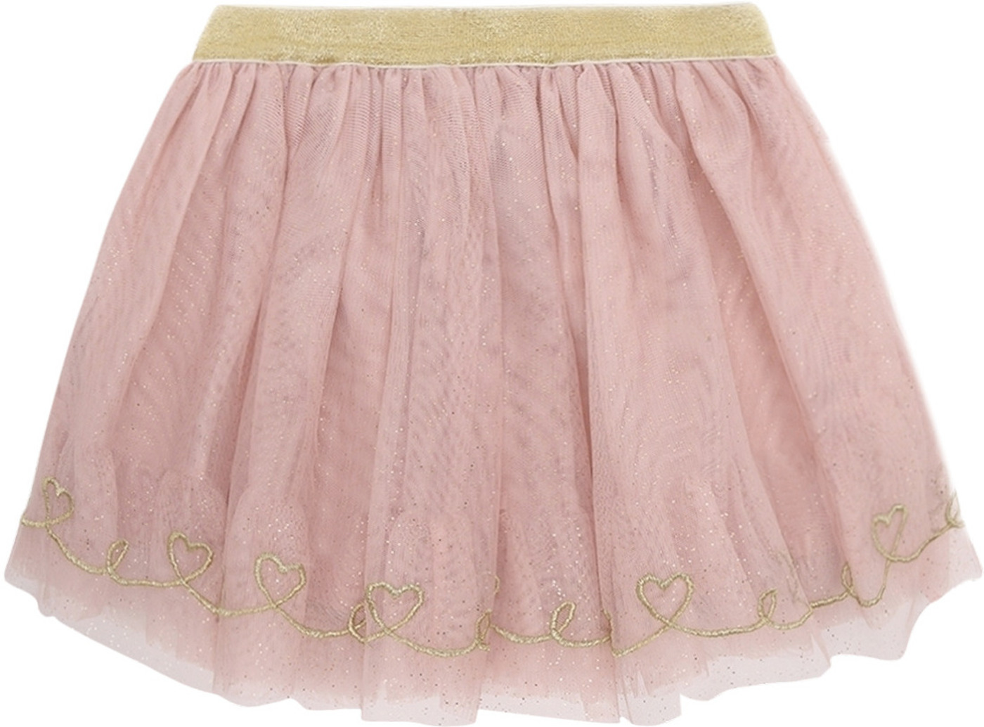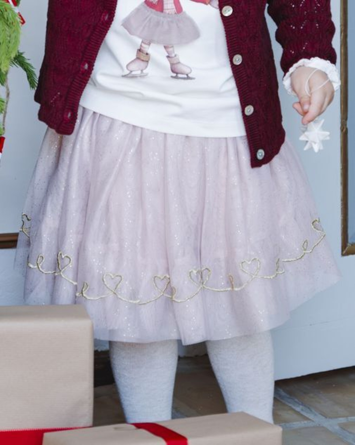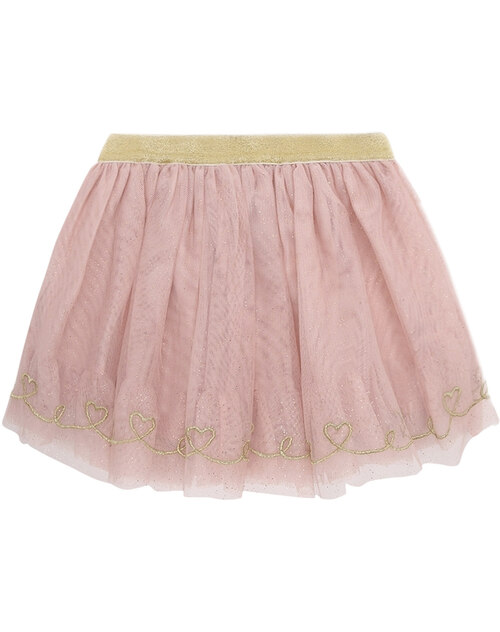 Dieser tolle Tüllrock von Hust and Claire wird mit seinen gold-schimmernden, aufgestickten Herzen und dem goldenen Bund zum liebsten Begleiter für festliche Anlässe und verzaubert den Alltag. ✨