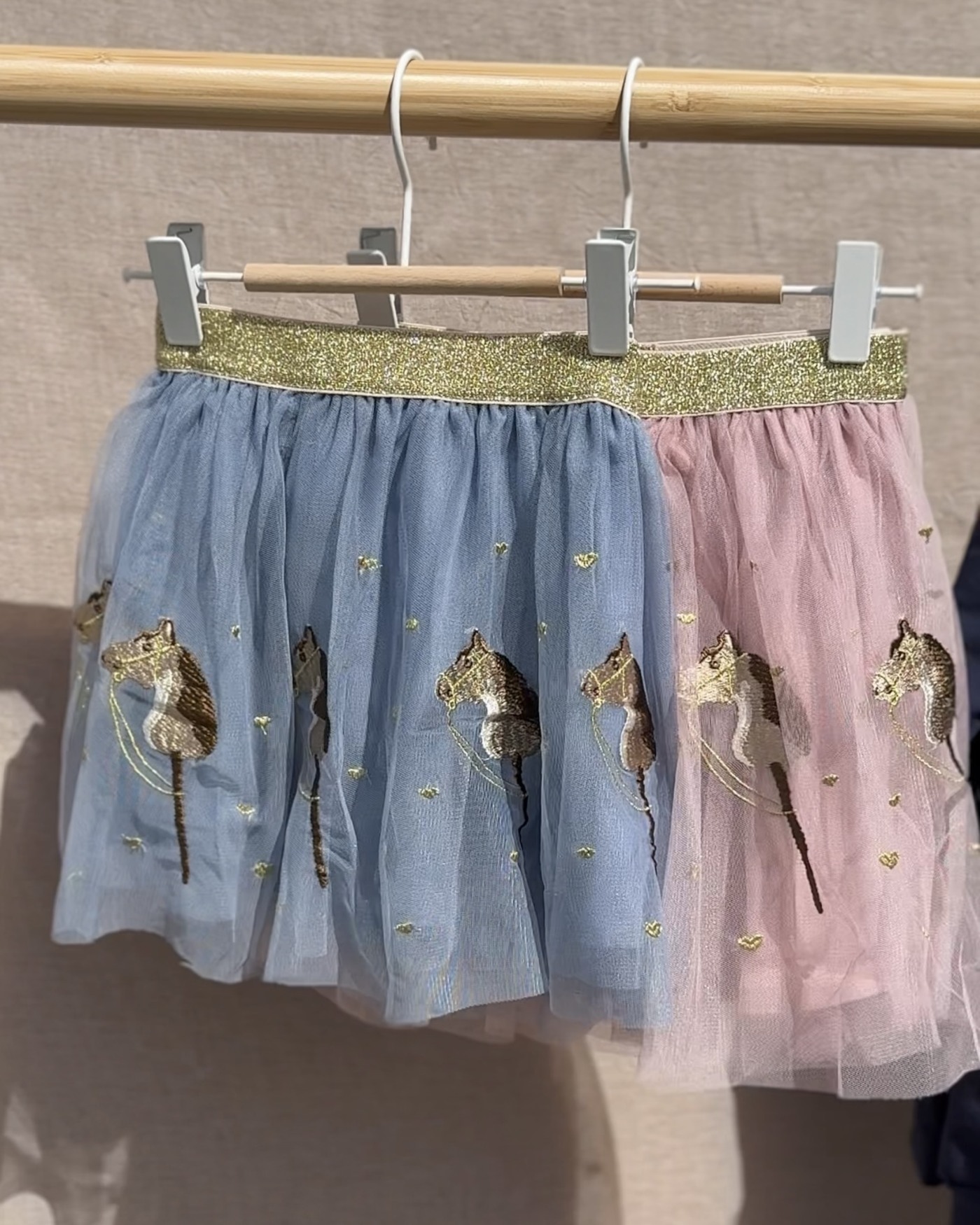 Den Tüllstoff verzieren bestickte Steckenpferde und goldene Herzen. 🐎 💛