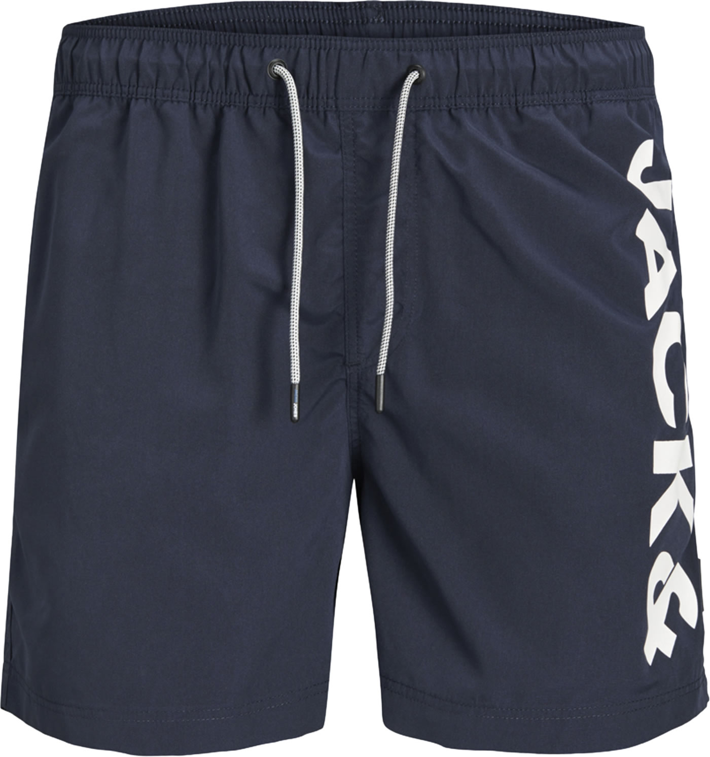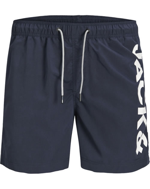 Dunkelblaue Badehose für Jungen von Jack & Jones. Das Gummibündchen sorgt für einen guten Sitz und die Weite ist durch das Zugband regulierbar. Von innen sorgt ein eingenähter Slip für ein komfortables Tragegefühl.