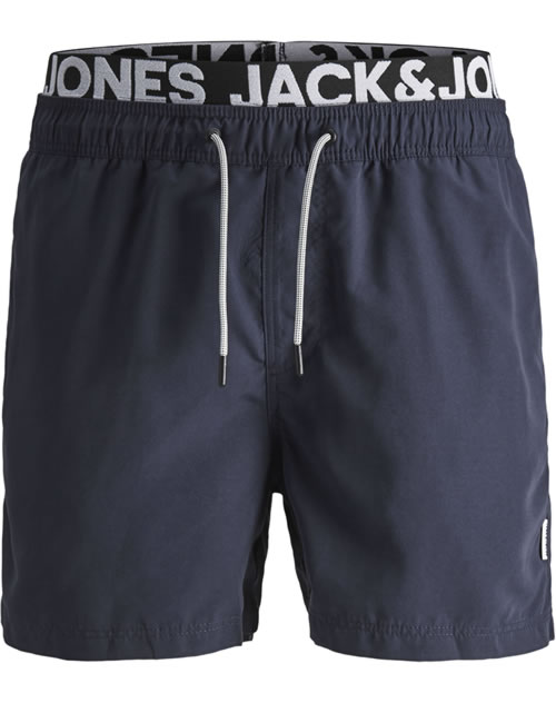 Dunkelblaue Badehose für Jungen von Jack & Jones. Das Gummibündchen sorgt für einen guten Sitz und die Weite ist durch das Zugband regulierbar. Von innen sorgt ein eingenähter Slip für ein komfortables Tragegefühl.