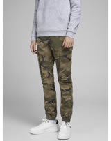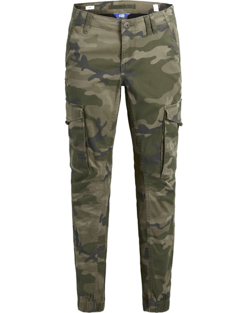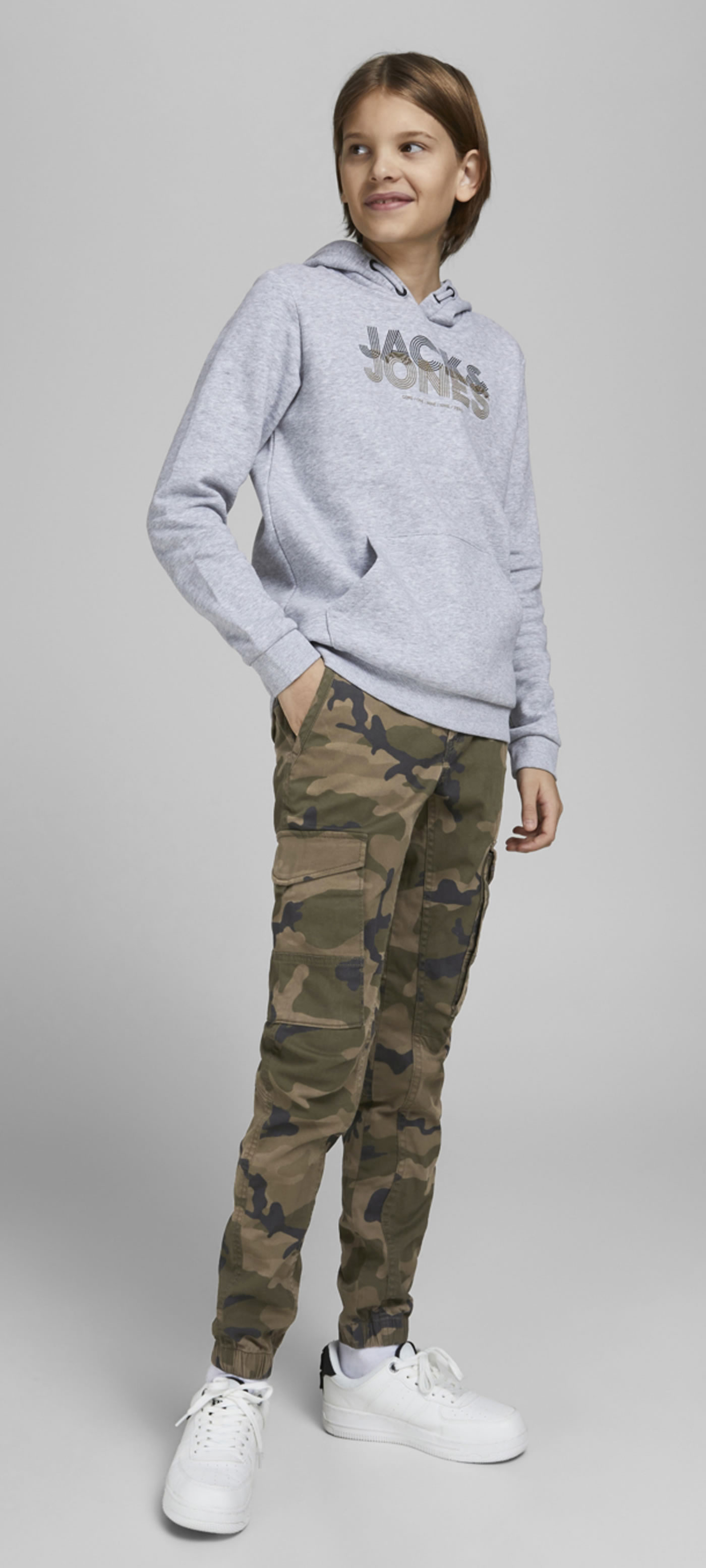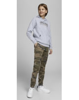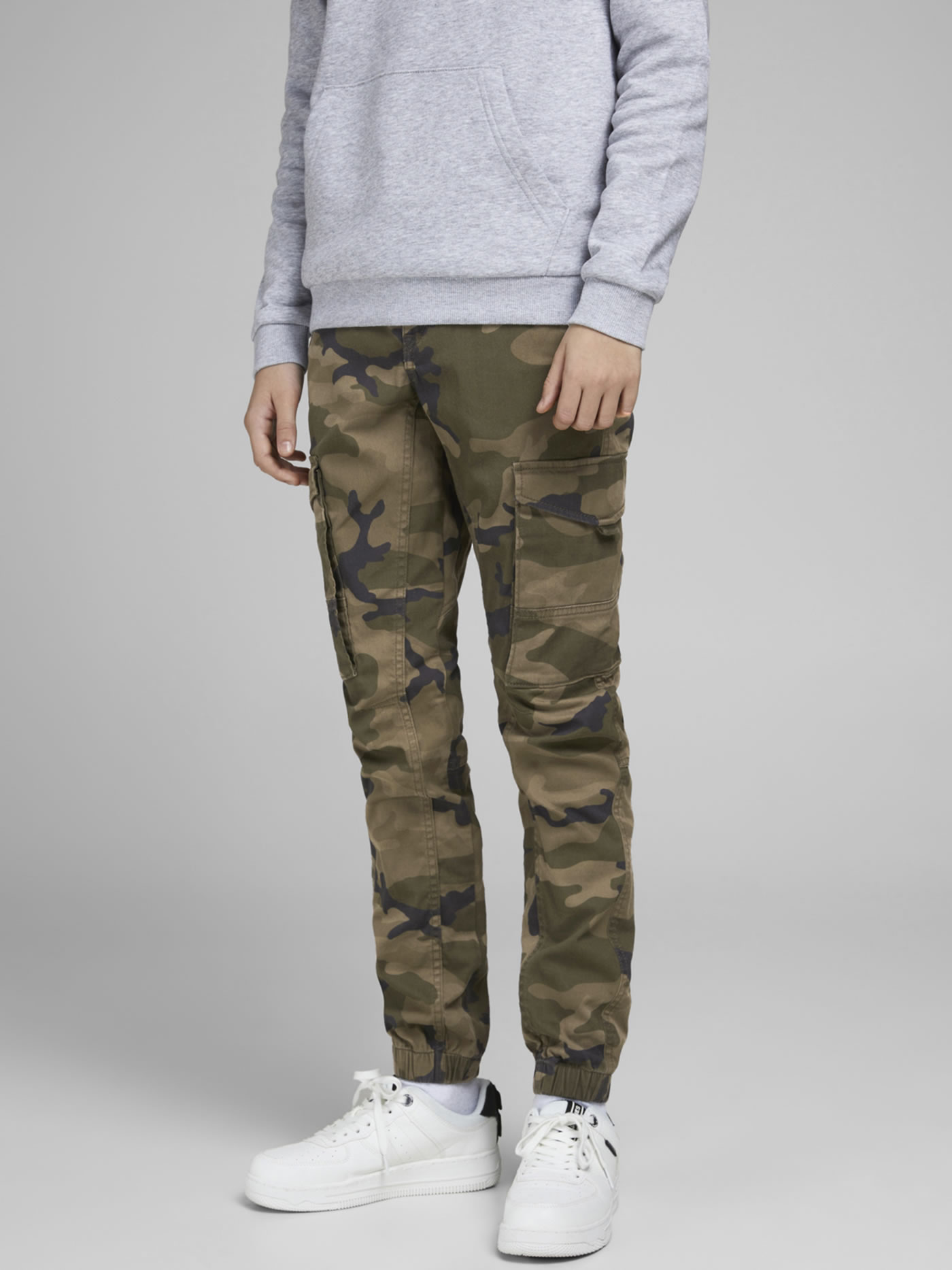 Coole Cargo Hose von JACK & JONES JUNIOR im Camouflage-Look. Das klassische Modell hat Taschen mit Druckknöpfen an den Beinen und Gummibündchen in den Beinenden. Zwei Gesäßtaschen und zwei Einstecktaschen an den Seiten bieten zusätzlich Platz für Kleinigkeiten. Der Hosenbund lässt sich durch einen Gummi-Einsatz und zwei Knöpfen bequem in der Weite verstellen. Die schmal geschnittene Hose lässt sich prima kombinieren.